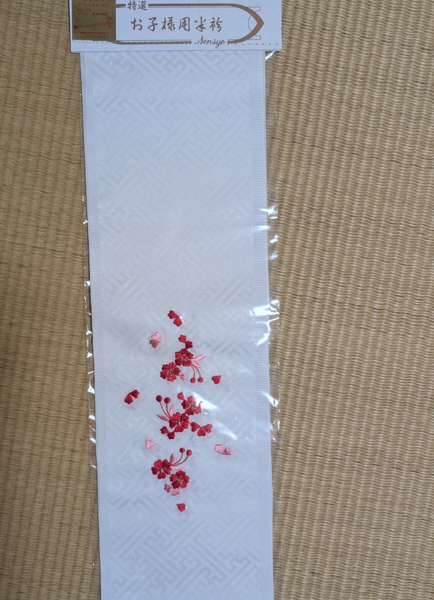 しつけ糸がついた美品の祝い着と、帯、長襦袢、小物のセットです。