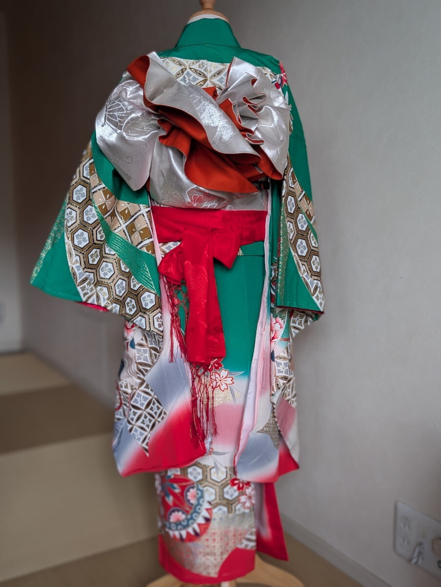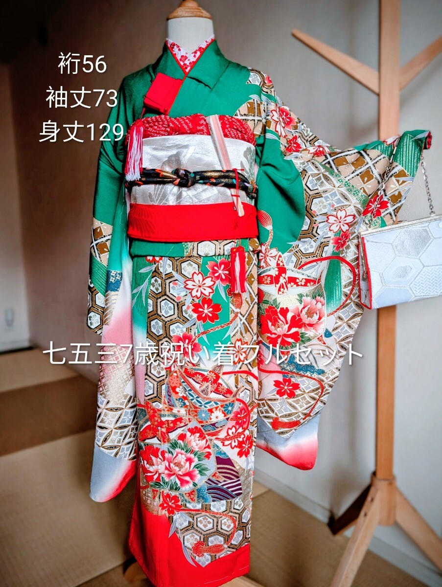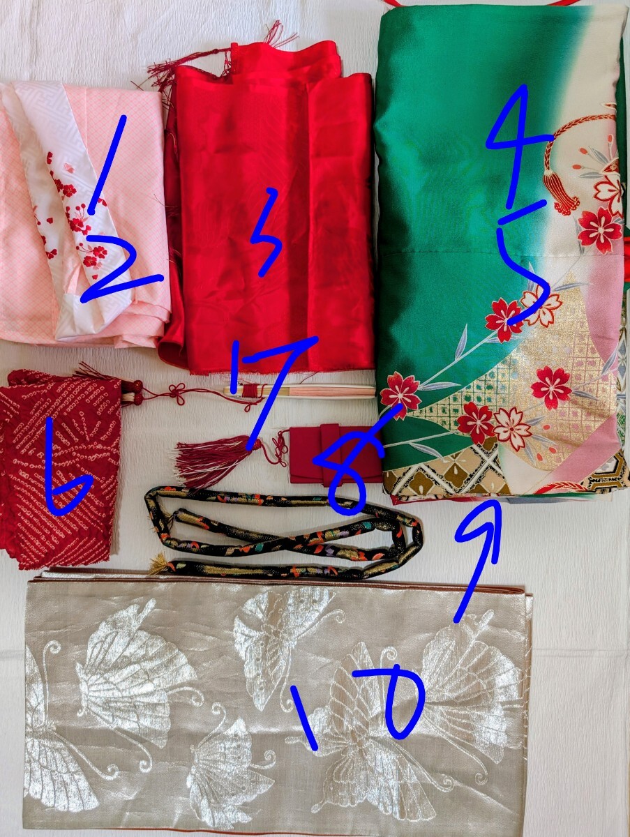 ①祝い着、②重ね襟縫い付け済み、③帯、④帯締め、⑤長襦袢、⑥新品刺繍半衿、⑦帯揚げ、⑧末広、⑨しごき(難あり。写真ご確認ください。)、⑩筥迫(びらかんはもともとなし)