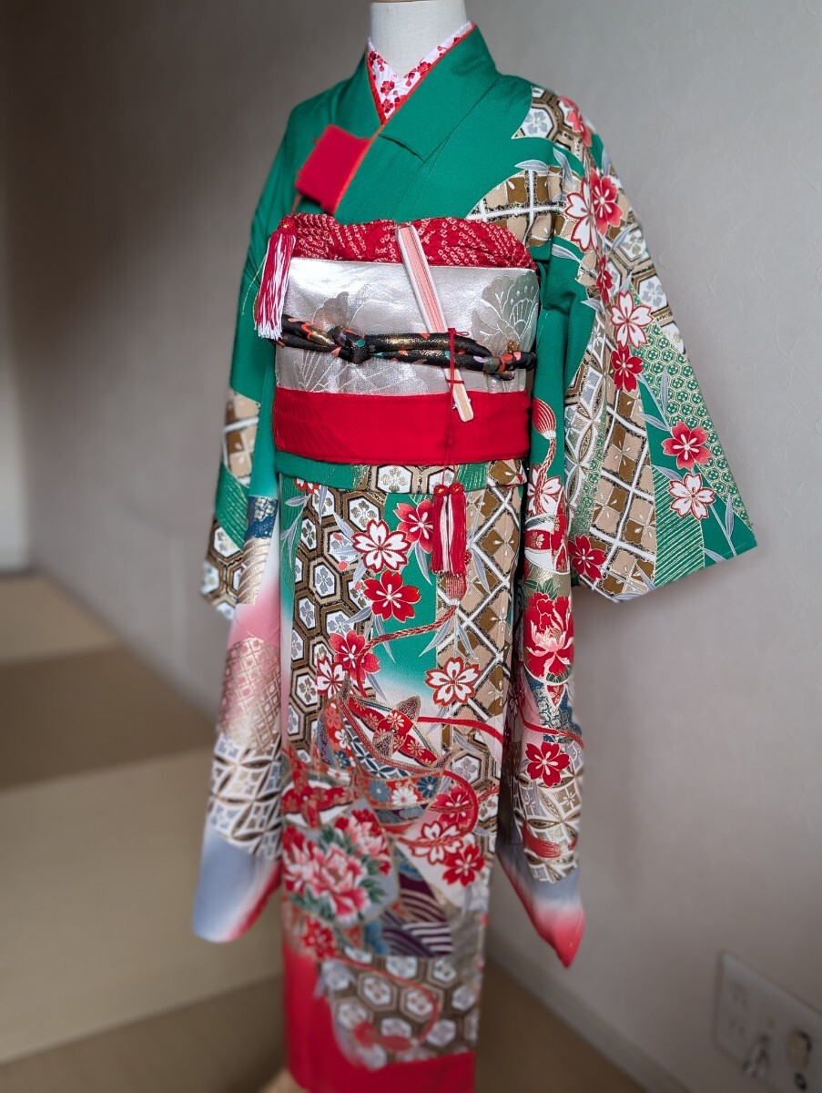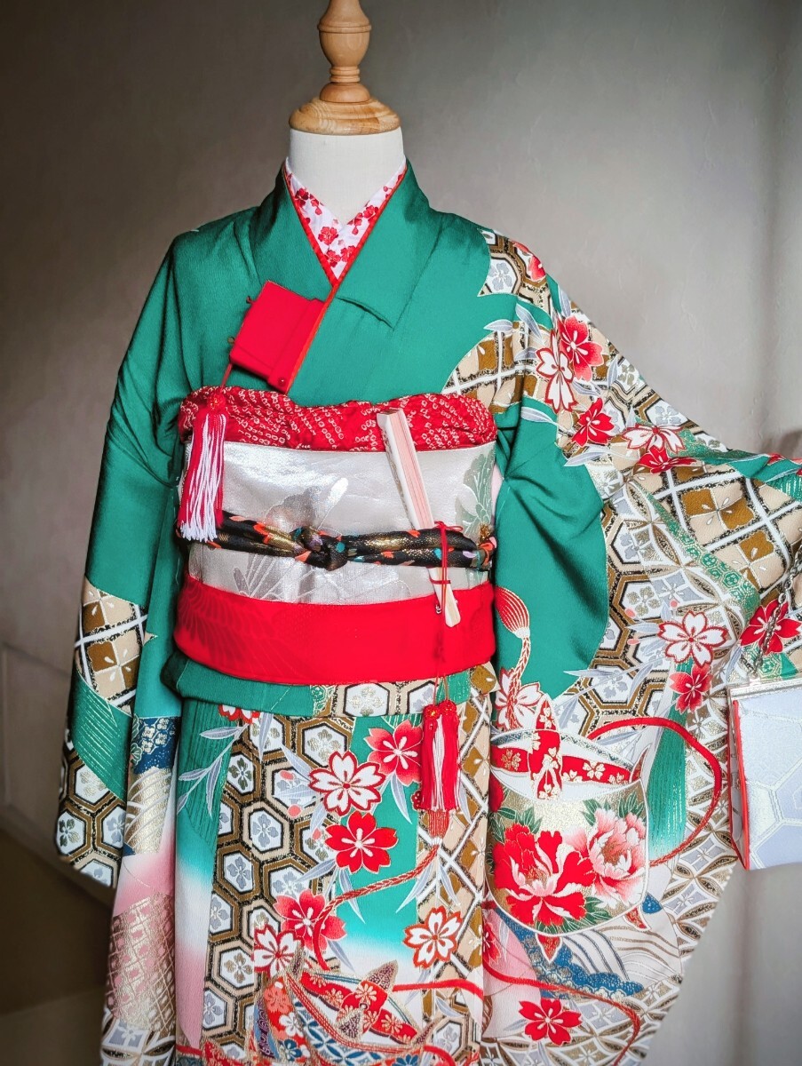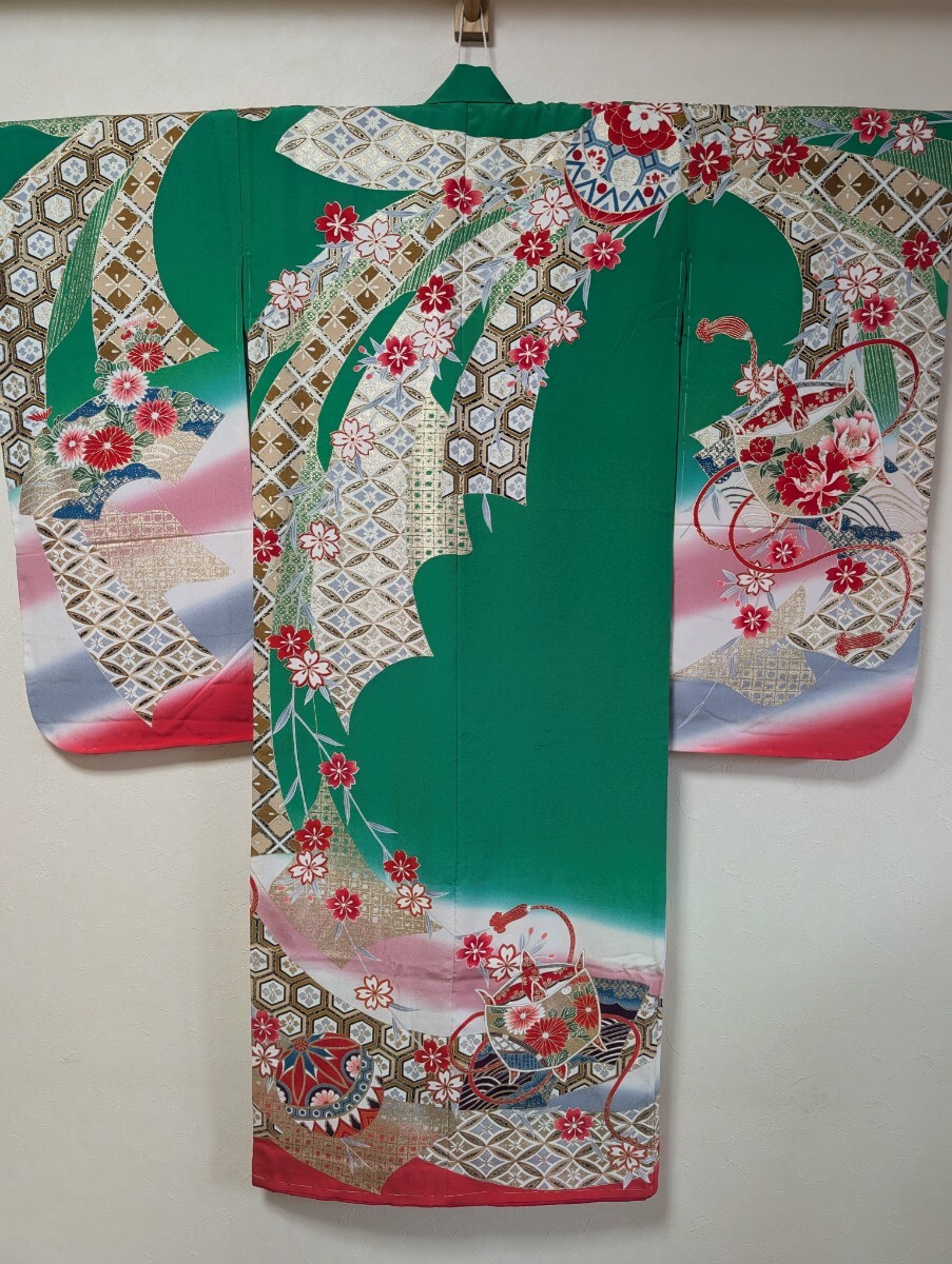 ①祝い着、②重ね襟縫い付け済み、③帯、④帯締め、⑤長襦袢、⑥新品刺繍半衿、⑦帯揚げ、⑧末広、⑨しごき(難あり。写真ご確認ください。)、⑩筥迫(びらかんはもともとなし)