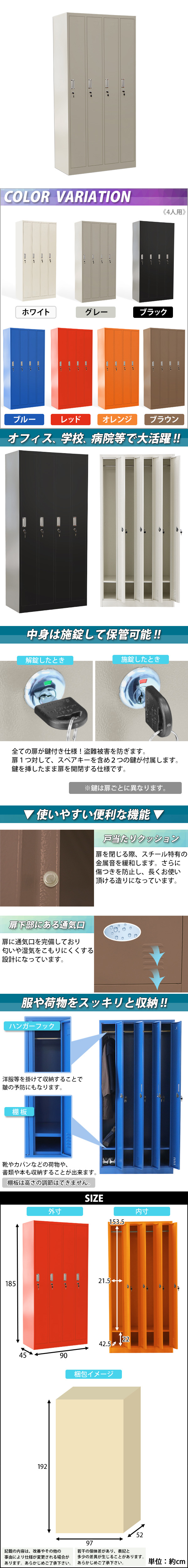 | 商品サイズ | ■本体寸法 約W 90×約D 45×約H 185(cm)(鍵は、合計8(内スペアキー4)個付属します。) ■ロッカー(内寸) 上段:約W 21.5×約D 42.5×約H 153.5(cm) 下段:約W 21.5×約D 42.5×約H 22(cm) ■梱包荷姿 約W 97×約D 52×約H 192(cm)/約52kg |