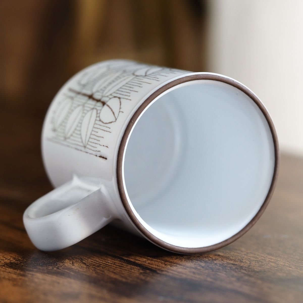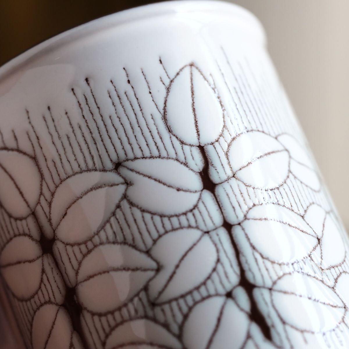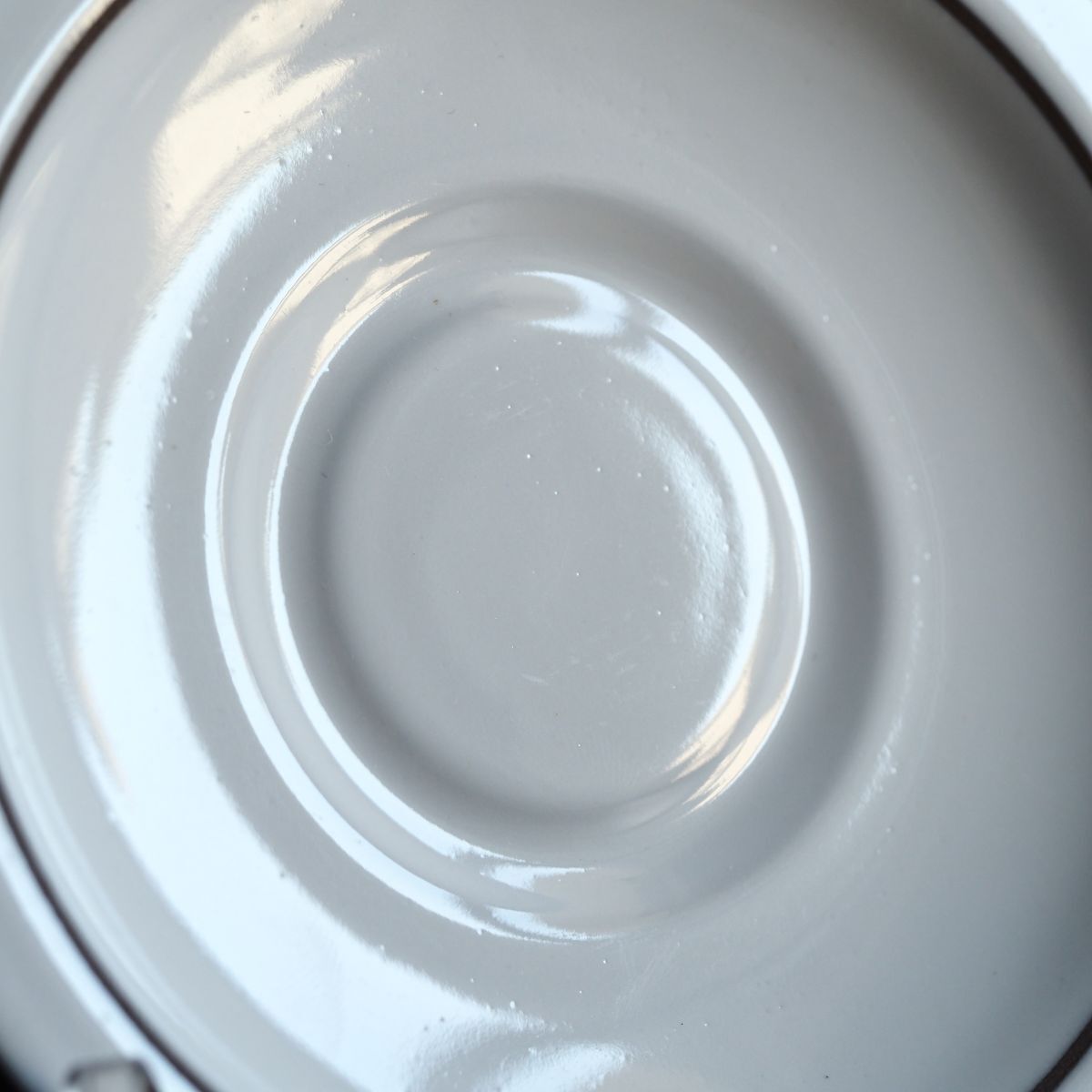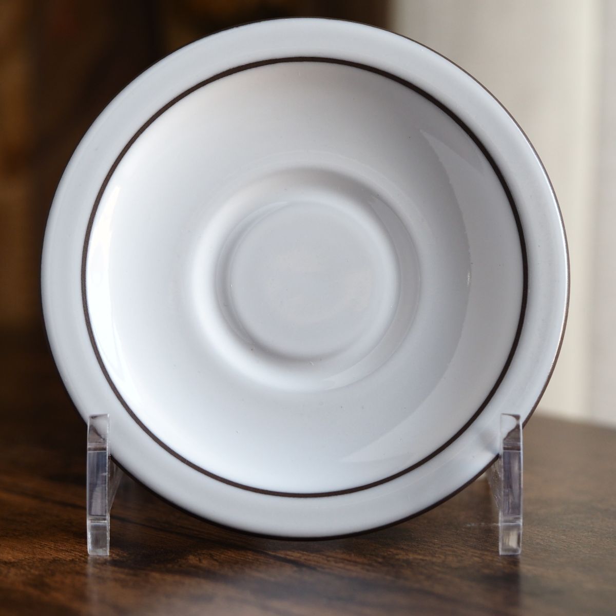 ご覧頂きありがとうございます。 こちらはイギリスの陶磁器メーカー ホーンジー社で制作された「Charisma/カリスマ」シリーズのカップ&ソーサーになります。 1970〜72年の短い間でしか生産されたなかった希少なモデルになります。モノトーンで純白の釉薬にホーンジーの製品によく見られる凹凸のある描き方で上に伸びる葉と上下に描かれた細いラインがアクセントとなって可愛らしいデザインです。コンディションも良くオススメです。 【寸 法】 高さ:76mm 径:62mm (バックスタンプあり) |