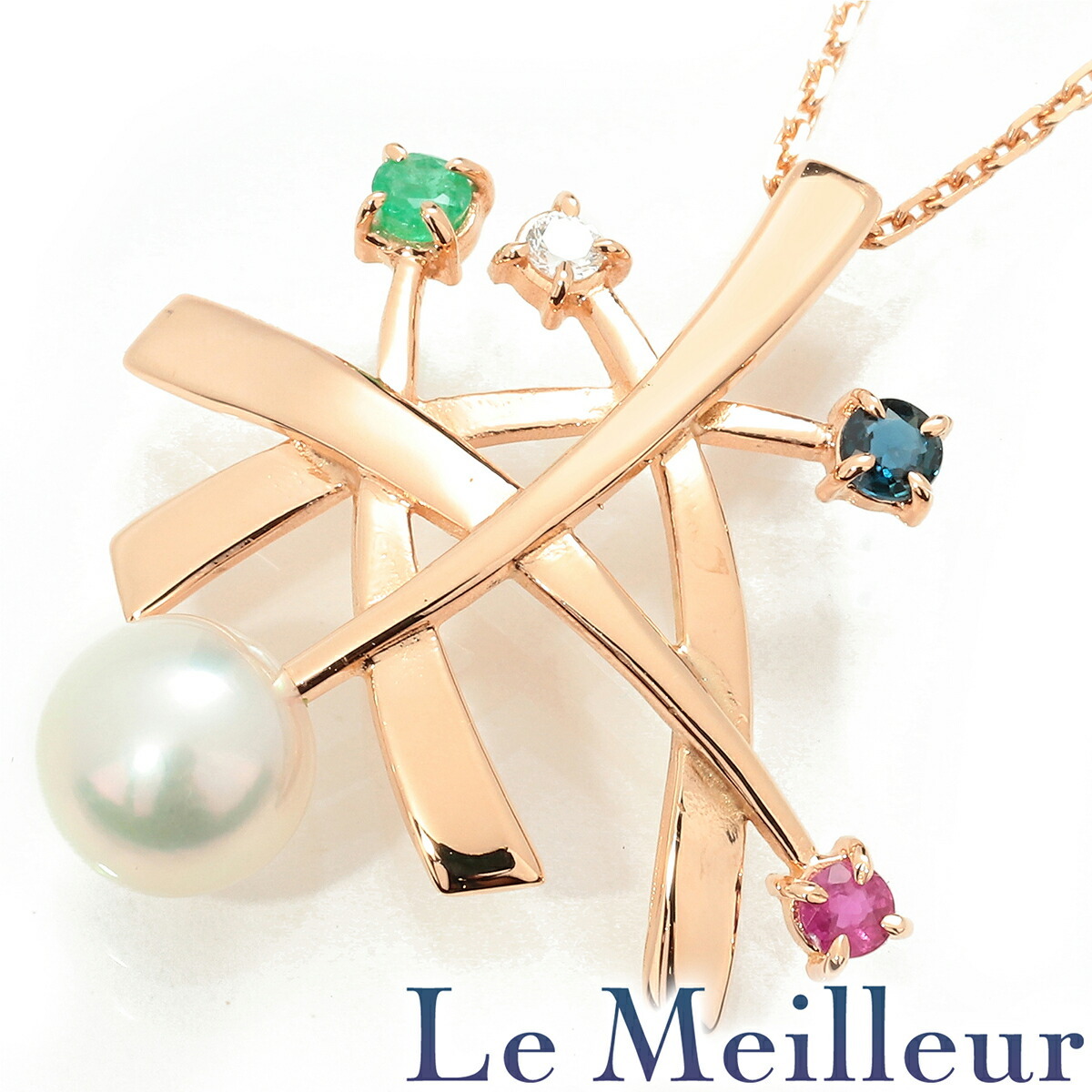 艶やかなアコヤ真珠を主役に、ダイヤモンド、ルビー、サファイア、エメラルドがやさしく寄り添うようにあしらわれた優雅なペンダント。色とりどりの宝石が調和するようにきらめきながら、胸元に華やぎと軽やかなリズムを添えてくれます。特別なひとときにはもちろん、ふとした瞬間にも目を惹く上品なアクセントとして寄り添うひと品です。