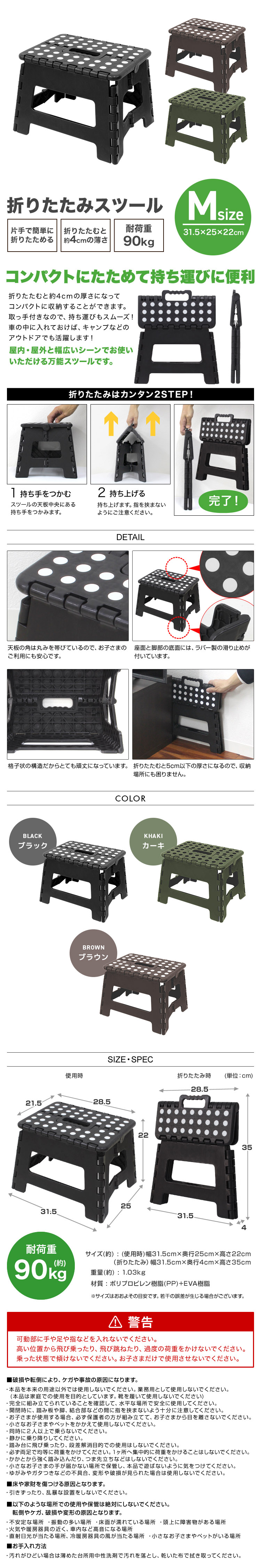 | 踏み台や折りたたみの椅子として、おうちに1台あると、とってもお役立ちのスツールです。 耐荷重は90kgまでなので、もちろん、大人の方が乗っても安心。 キッチンにて高いところのものを取ったり、玄関にて靴をはくときにちょっと腰掛けたり、野外に持ちだしてキャンプやスポーツのときの椅子としても活用できます。 洗車をする時の踏み台として、車に常備しておくのもお勧め。 用途はまだまだたくさんありそう、あなたの生活スタイルにあわせて、スツールをご活用ください。 折りたたむとカバンのようなカタチになるので、持ち運びもラクラク。 簡単に組み立てることができるので、お子様でも簡単に折りたたむことができます。 【商品詳細】 カラー:ブラック サイズ ・使用時:(約)幅31.5cm×奥行25cm×高さ22cm ・折りたたみ時:(約)幅31.5cm×奥行4cm×高さ35cm 重量:(約)1.5kg 耐荷重:(約)90kg 素材:ポリプロピレン、EVA ※転倒やケガにつながる恐れがありますので必ず、平坦な場所でのみご使用ください。 ※折りたたみ時に各部に手を挟まないよう、十分にご注意ください。 ※商品を使用して発生した事故・トラブル・破損等につきましては一切の責任を負いかねます。 |