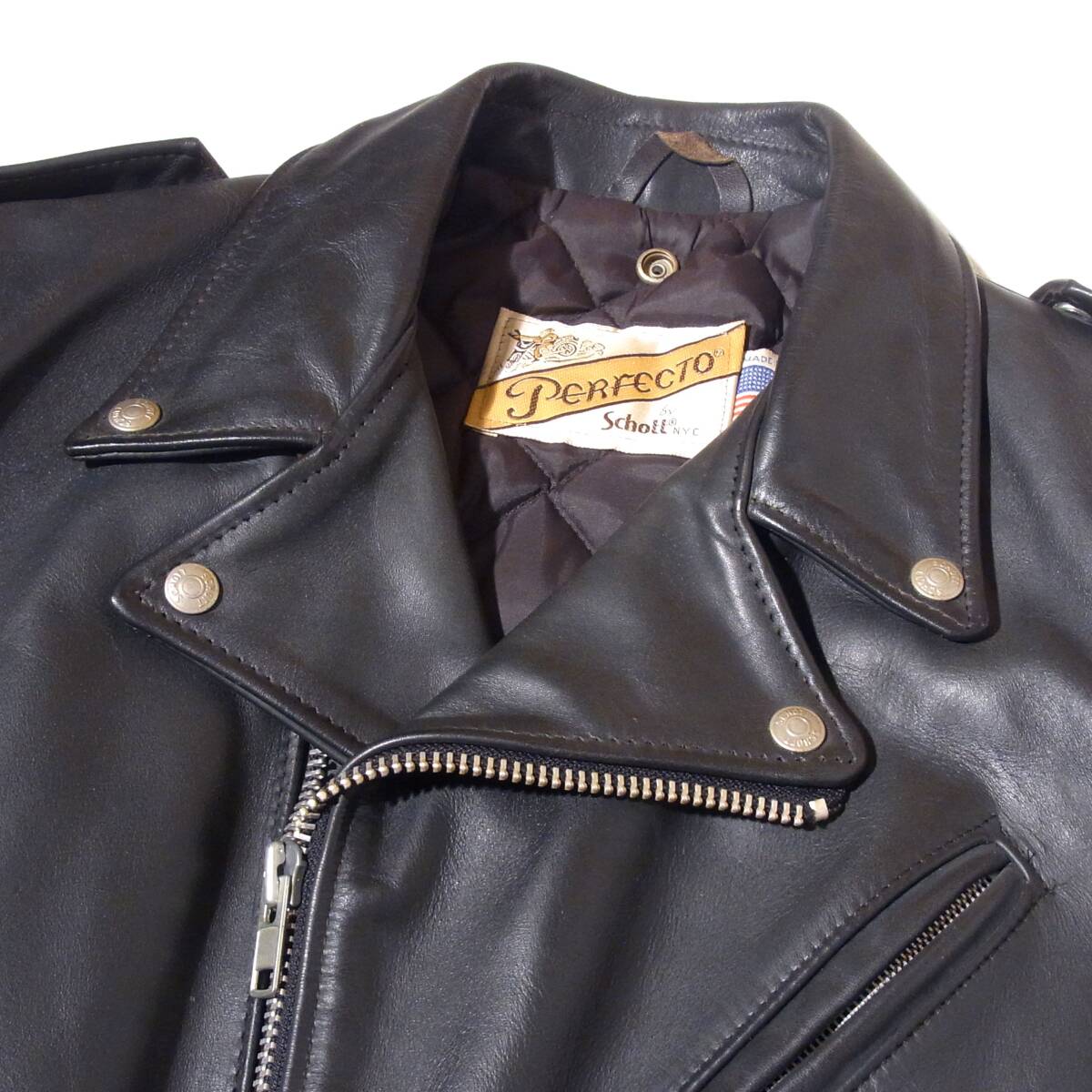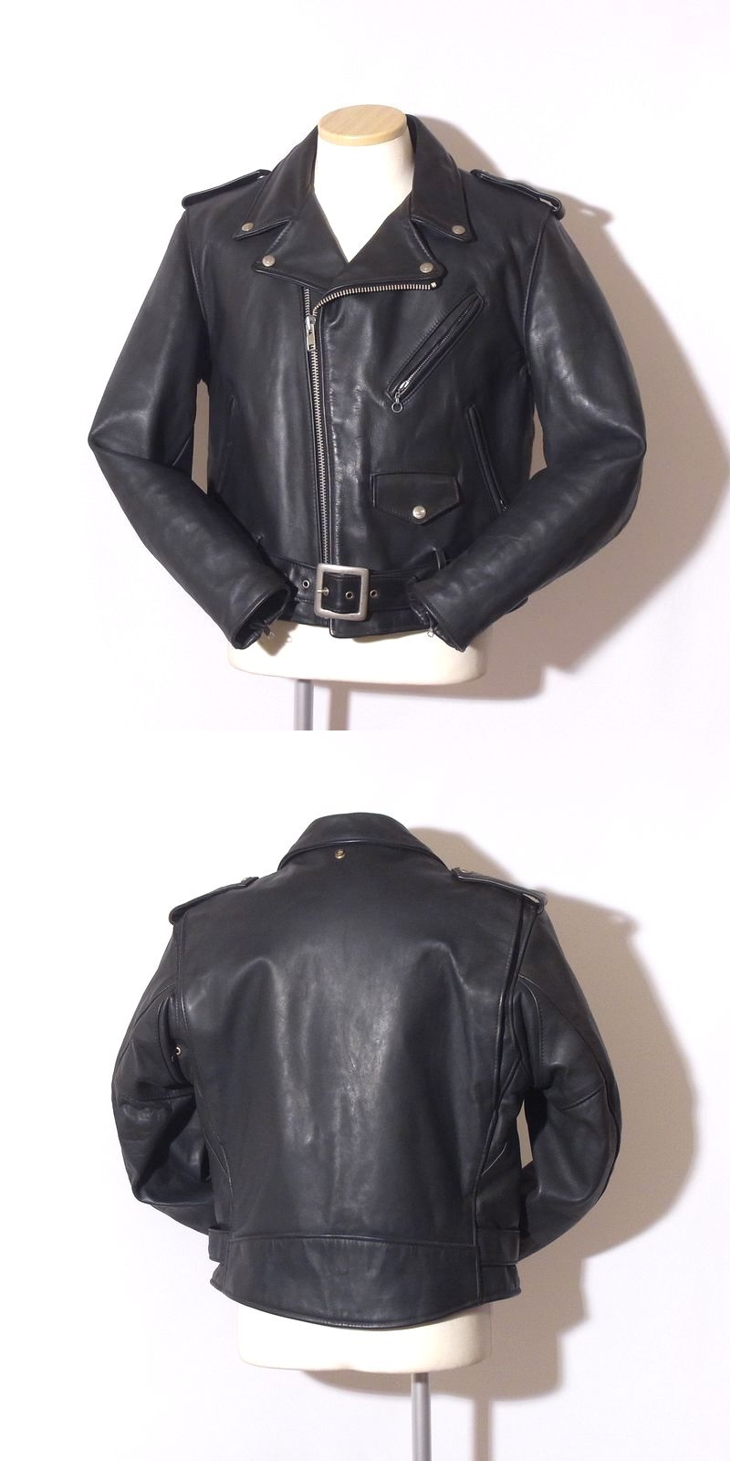 ■Schottのダブルといえば肉厚ステアハイドレザーの618が定番となります。