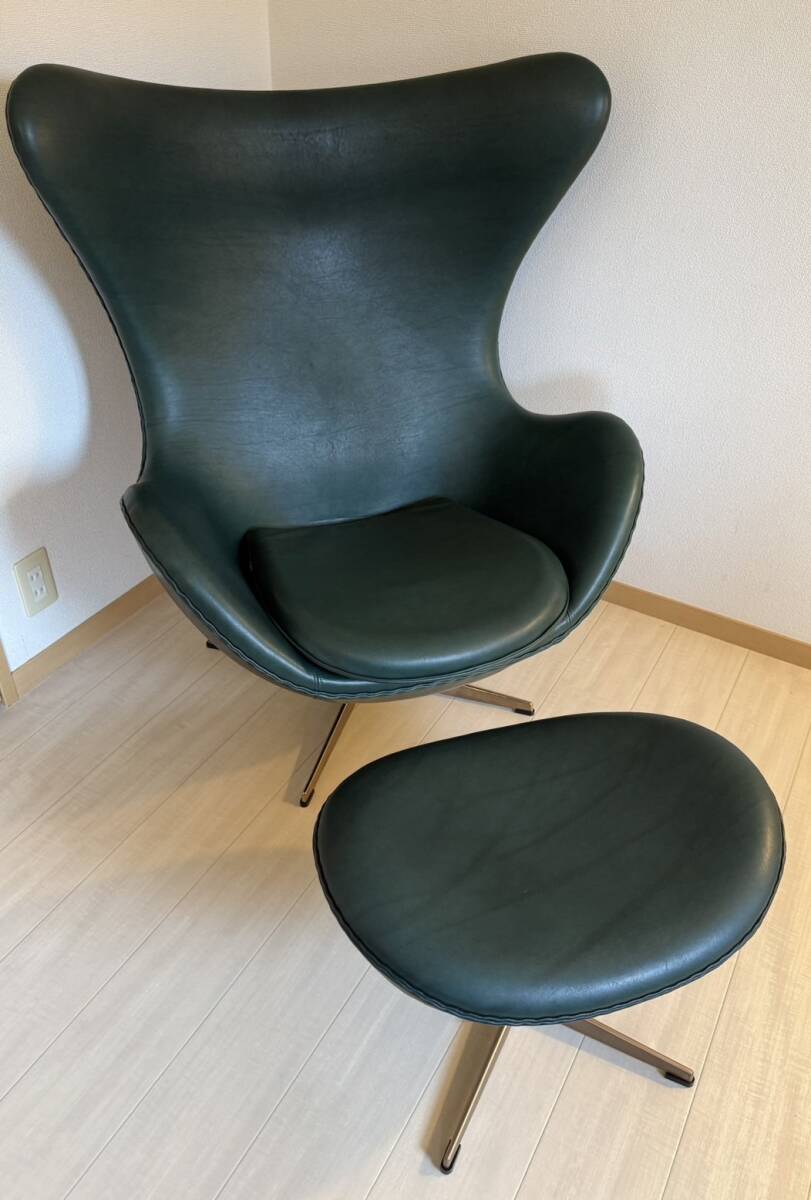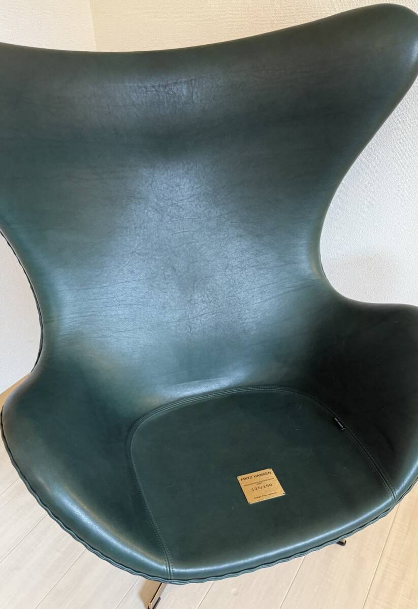 ご覧いただきありがとうございます。 アルネヤコブセンがデザインしたエッグチェアとフットスツールです。 フリッツハンセンの創業150年を記念して150脚限定で製作、国内では10脚のみ入荷された希少な品です。 限定生産品のため通常ラインでは取扱いがなく、チェアには記念のプレートが埋め込まれています。 レザーはフォレストグリーンに染色された天然のピュアレザーを使用しており、一脚一脚が異なる質感を持っています。 チェアスツールの脚部も特別仕様でPVDコーティングを施したカッパー(銅)カラーです。 商品の状態は極めて良好です。温度や湿度を管理した部屋で丁寧に保管しておりました。 販売はスツールとセットになります。保証書等全て完備しており販売時のタグも付属します。 |