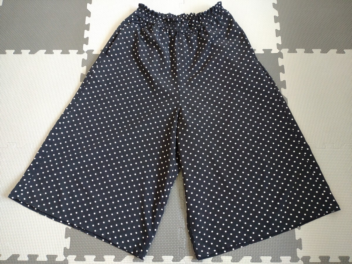 ブラックに白の水玉模様のハーフパンツ、ウエストゴムで快適な着心地。
