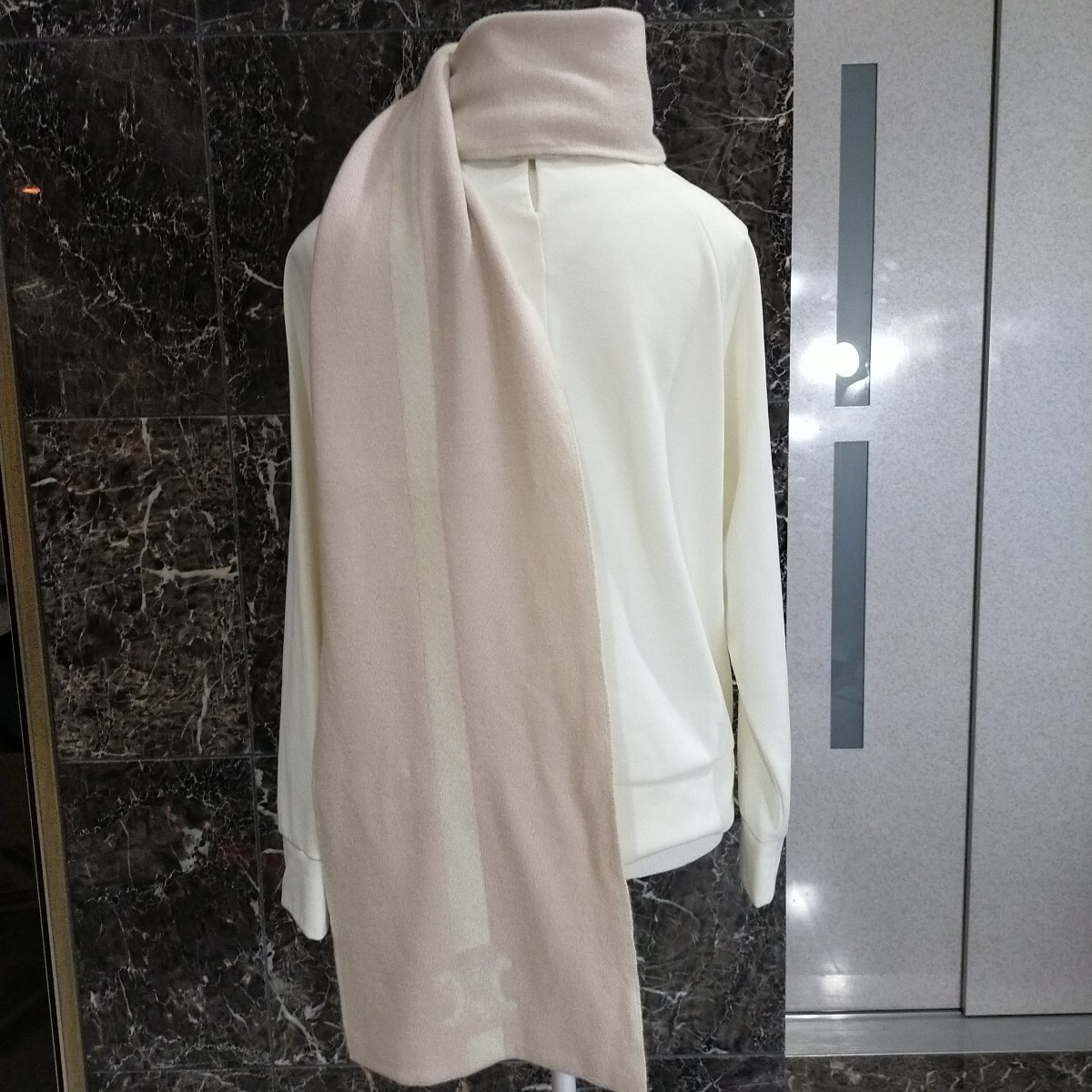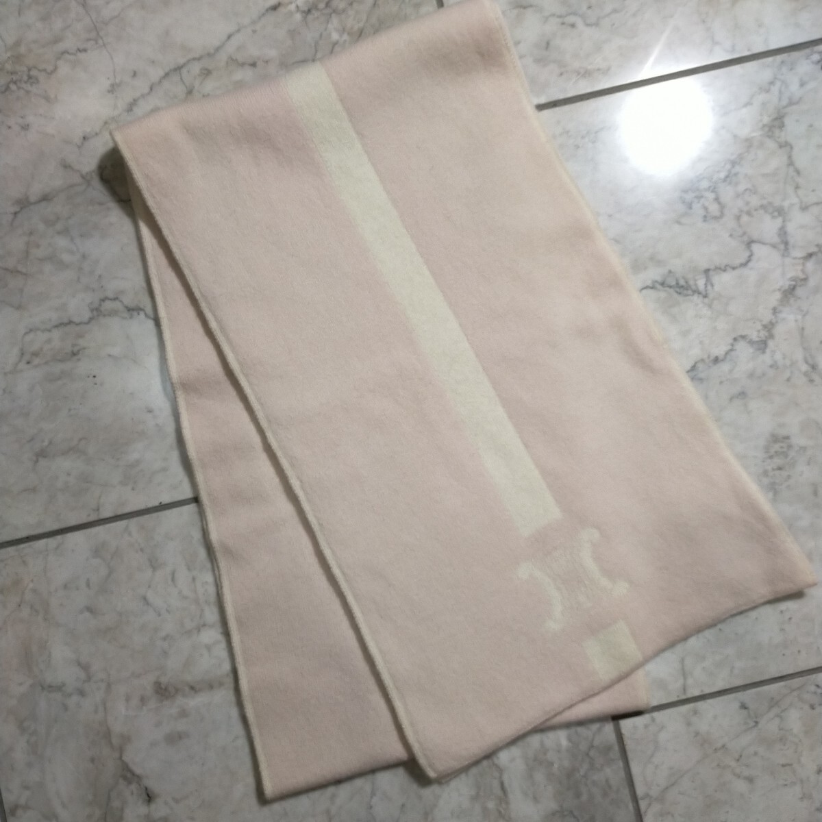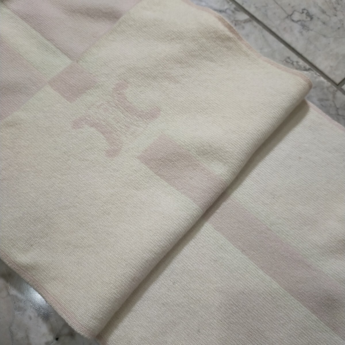 都内「CELINE」ブティックにて定価で購入いたしました 《ベビーピンクxオフホワイトの優しい配色》が大変可愛らしい「CELINE」ロングマフラーorストールです。 生地は《カシミヤ配合 》なのでキメが細かくて柔らかく高級感があります。 《ベビーピンクカラーベースにオフホワイトのラインとトリオンフ織柄》が目立ちすぎず上品で、でもしっかりセリーヌ感を主張しております。 購入直後は何回か着用しております。 クリーニングに出しクローゼットに保管しておりました。 素材上 若干の毛羽立ち感、又保管ジワ癖などございますが全体的には綺麗で状態の良いお品だと思います。 ご理解の上写真をご覧になって判断し 入札をお願いします。 神経質な方は入札をご遠慮ください。 ノークレーム・ノーリターンでお願いします。 サイズは全長184cm 幅26cm ライン幅3cm トリオンフ5.5cm ×6cmです。