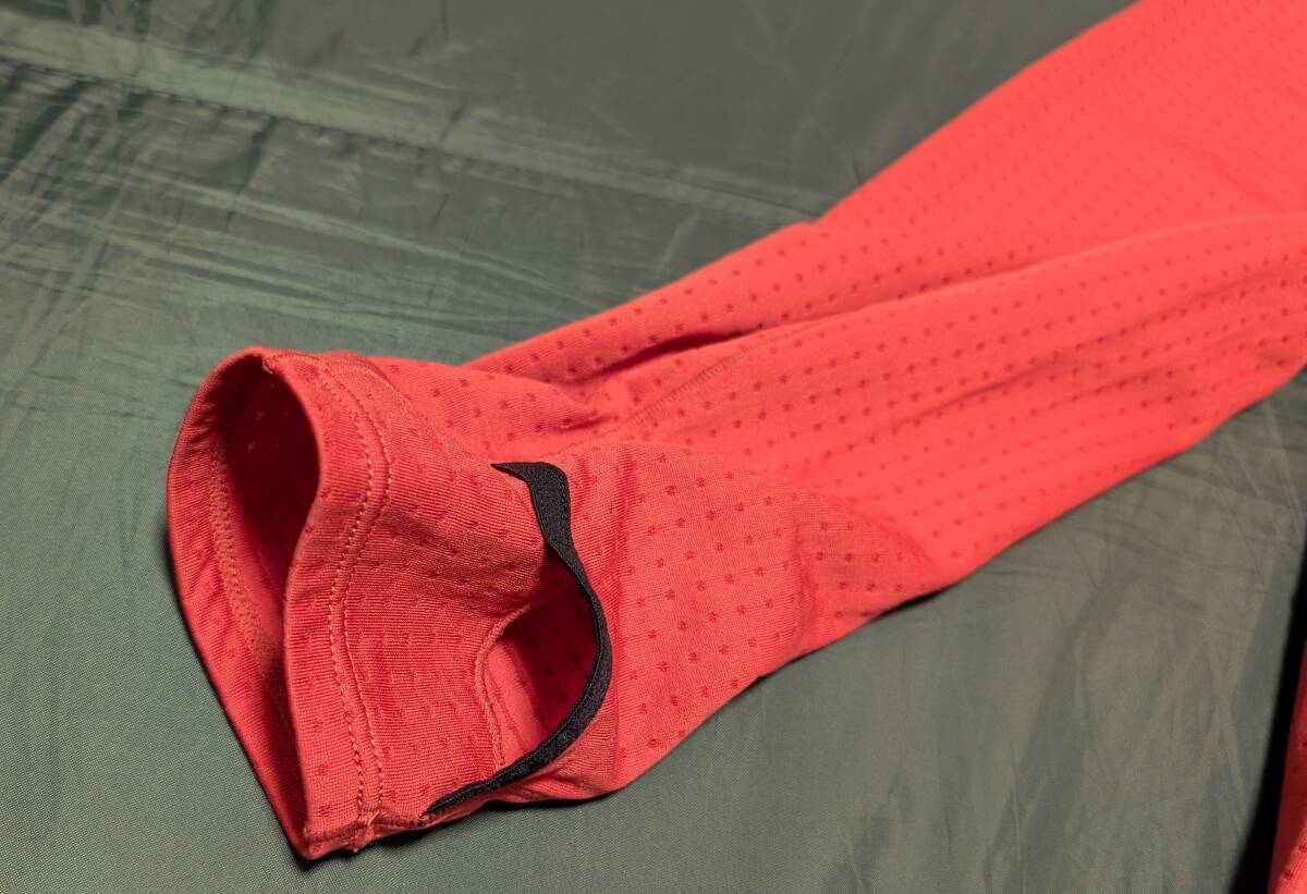 袖口はサムホール仕様。胸ポケットにはストレッチ生地を用い、スマートフォンや地図などを楽に収納できます。首を日焼けやロープから守る高い襟のジップアップ仕様です。