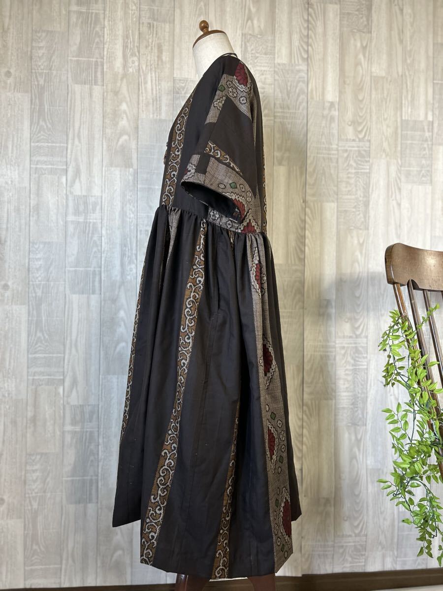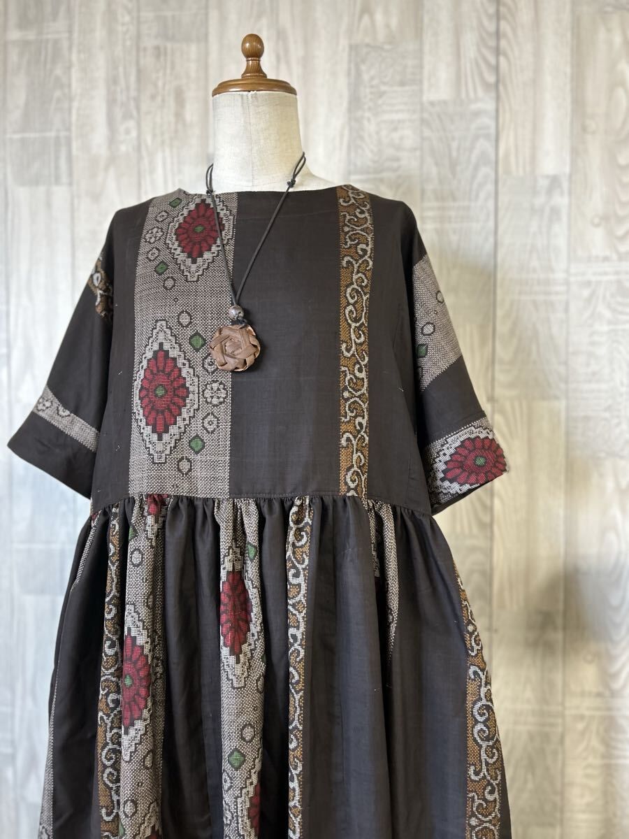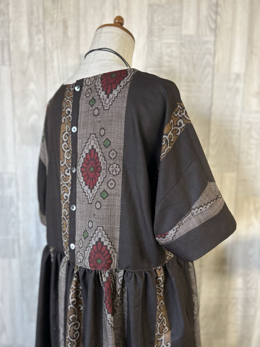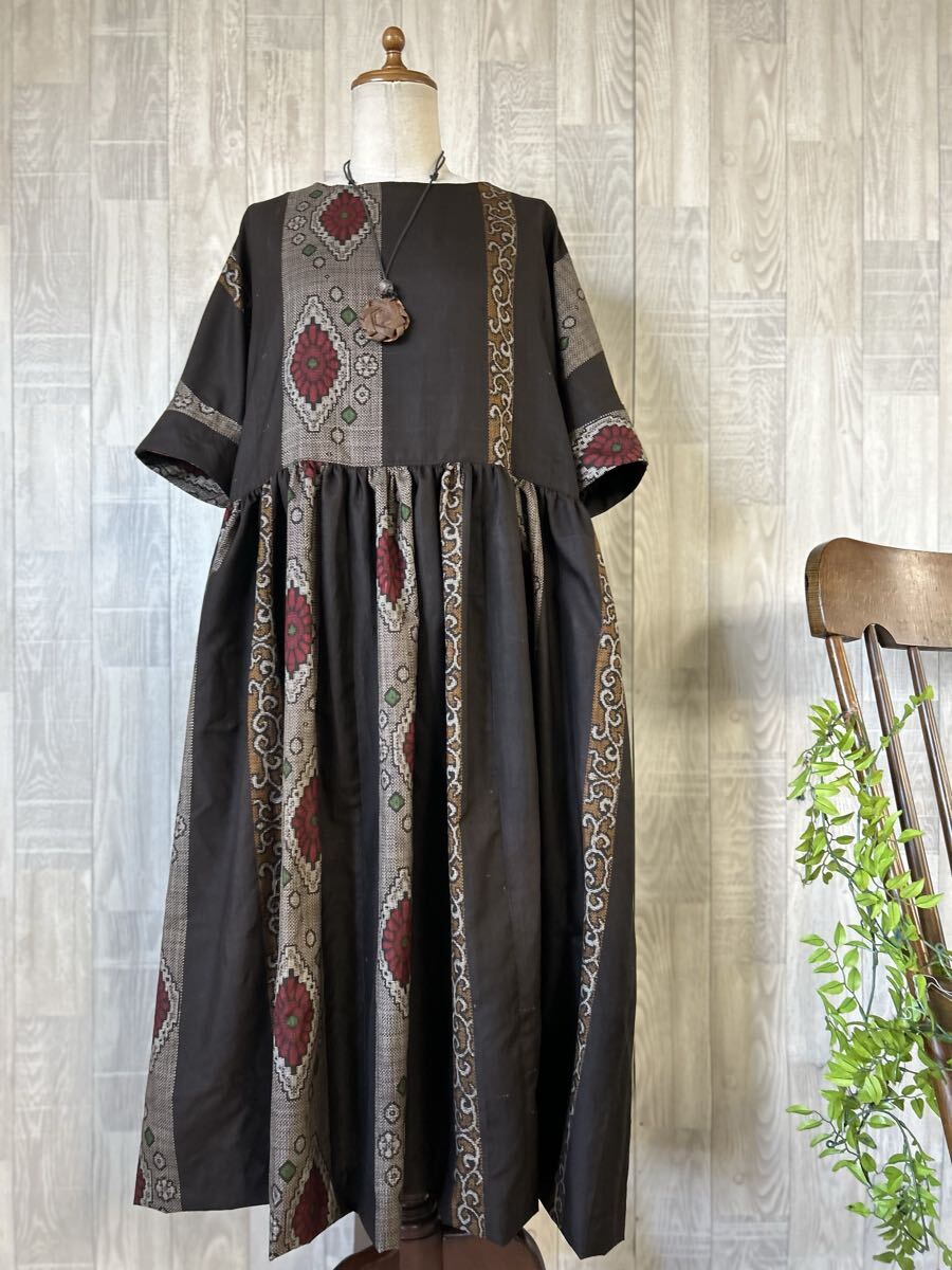 ★古布 着物リメイク アンティーク 茶泥大島紬 バックボタンのギャザーワンピース ハンドメイド★