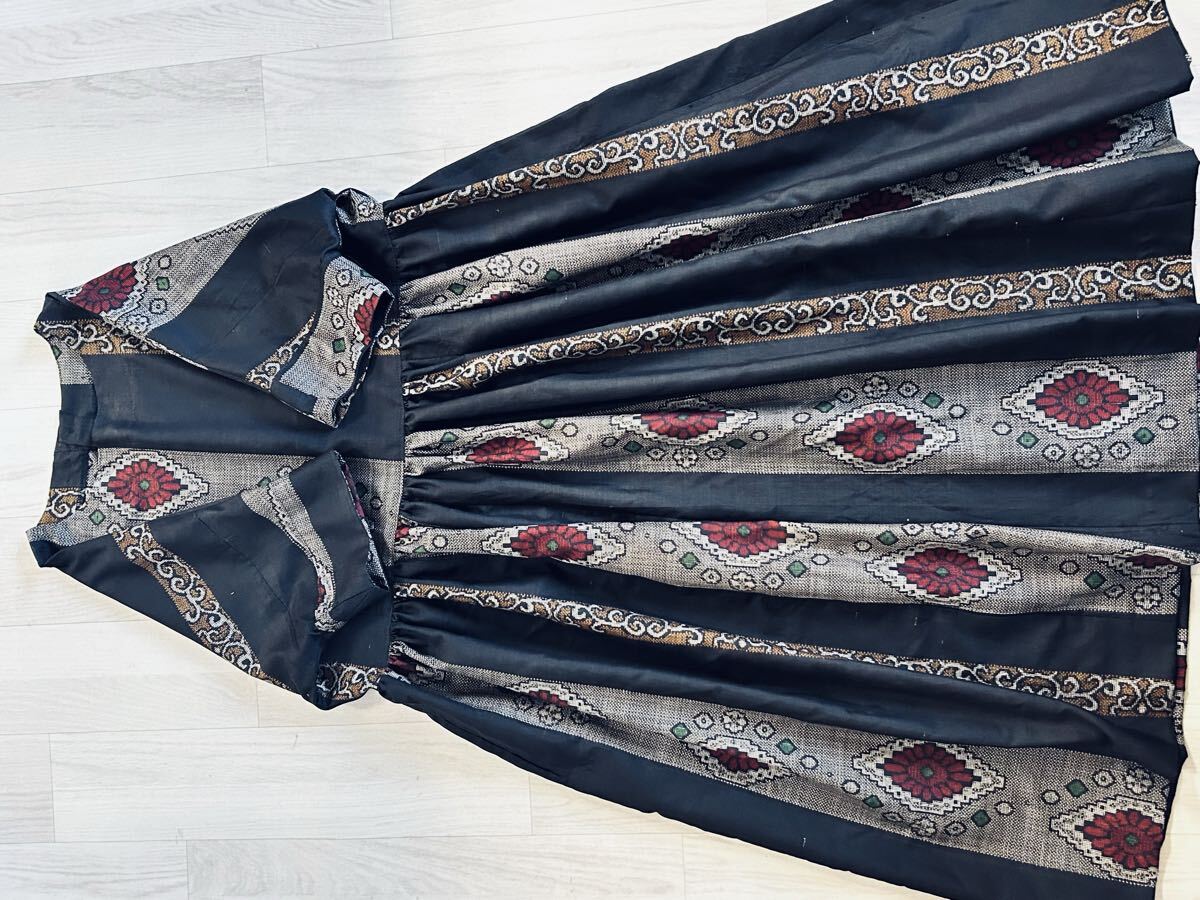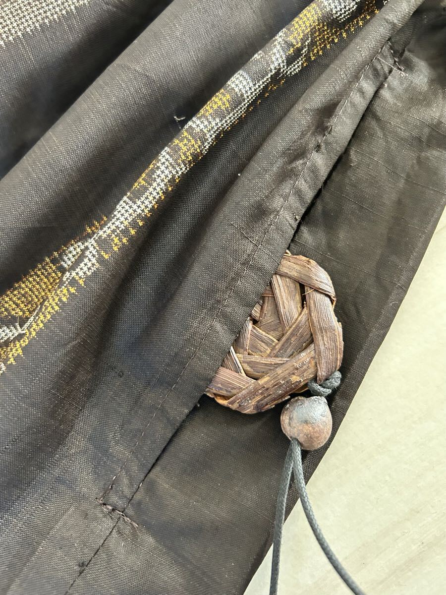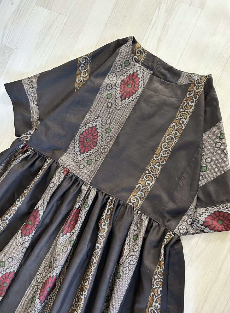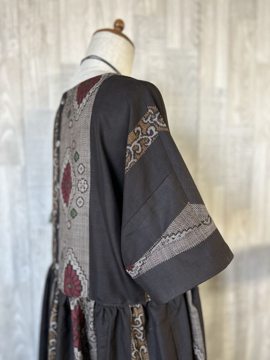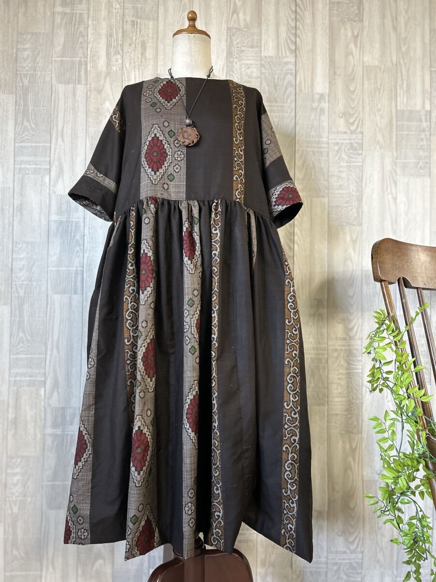★古布 着物リメイク アンティーク 茶泥大島紬 バックボタンのギャザーワンピース ハンドメイド★