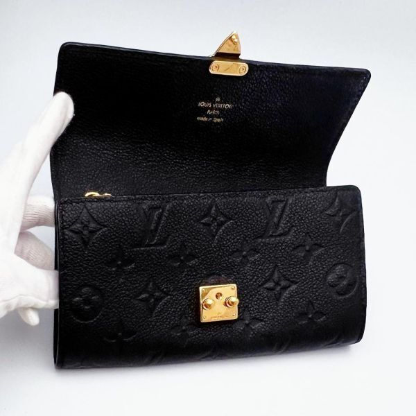 ルイ・ヴィトンの伝統的なトランクを想起させるSロックスタイルの留め具!内装にはファスナー開閉式コインポケット、2つのマチ付きポケット、豊富な16枚カードスロットを備えています。