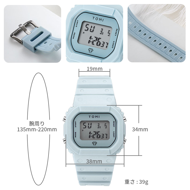 機能:時間表示(12時間/24時間表示)、日付表示、曜日表示、アラーム、ストップウォッチ、バックライト