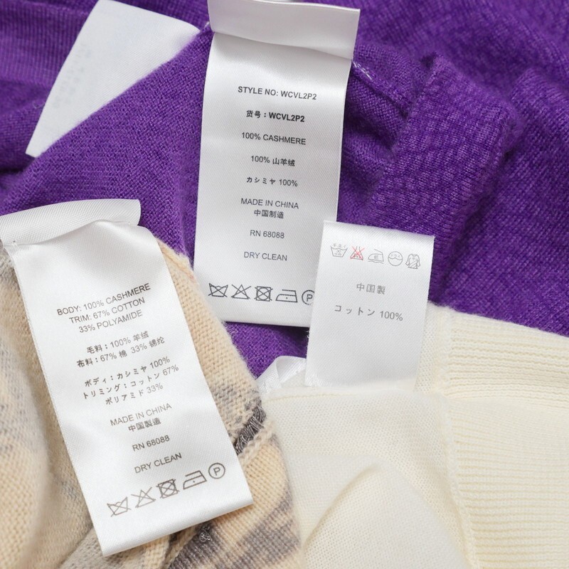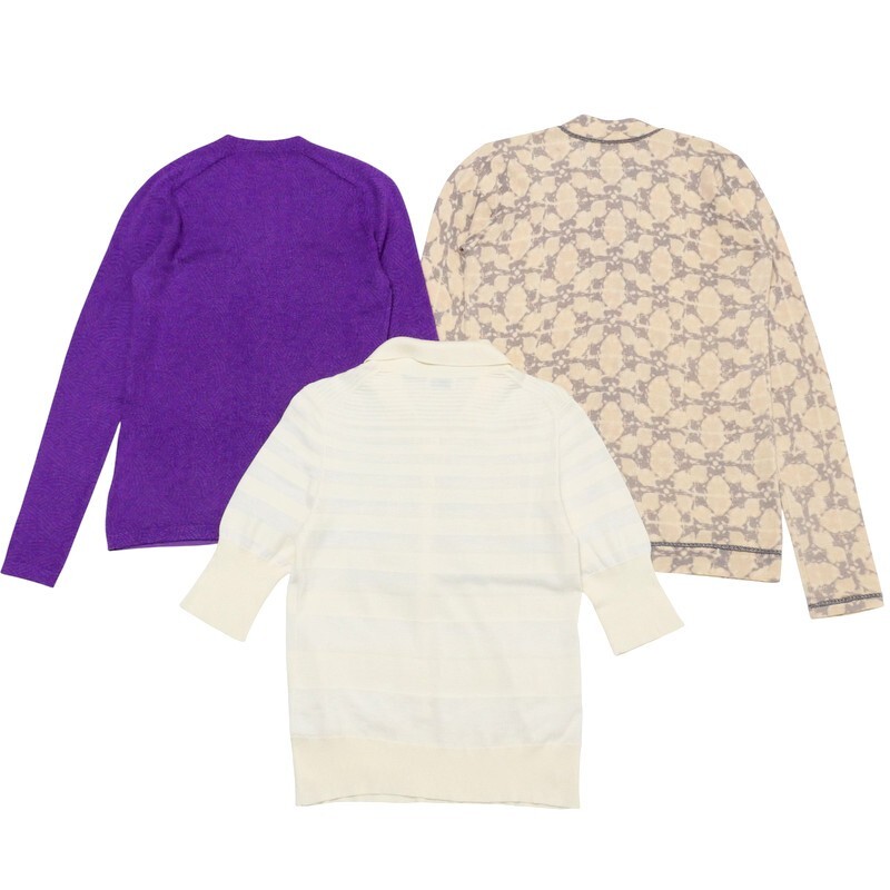 パープルのカーディガン :カシミヤ100% ベージュの総柄カーディガン 身頃 :カシミヤ100% トリミング :コットン67%、ポリアミド33% アイボリーの5分袖 :コットン100% |