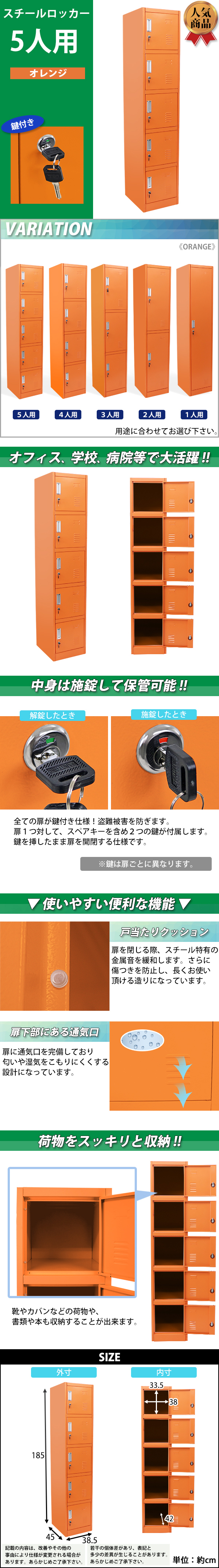 | 商品名 | 送料無料 ロッカー おしゃれ スチールロッカー 5人用 オレンジ 鍵付き スペアキー付き 1列5段 スチール製 収納 オフィス 事務所 会社 店舗 病院 学校 業務用 スリム かぎ付き 更衣ロッカー 更衣室 オフィスロッカー スチールキャビネット オフィス家具 10009newor |