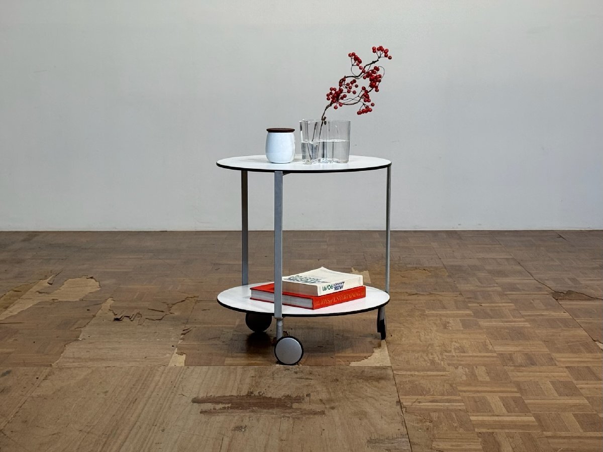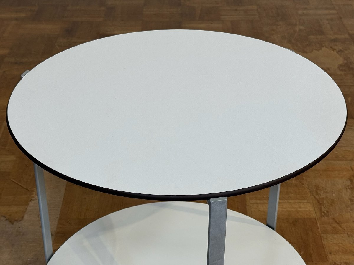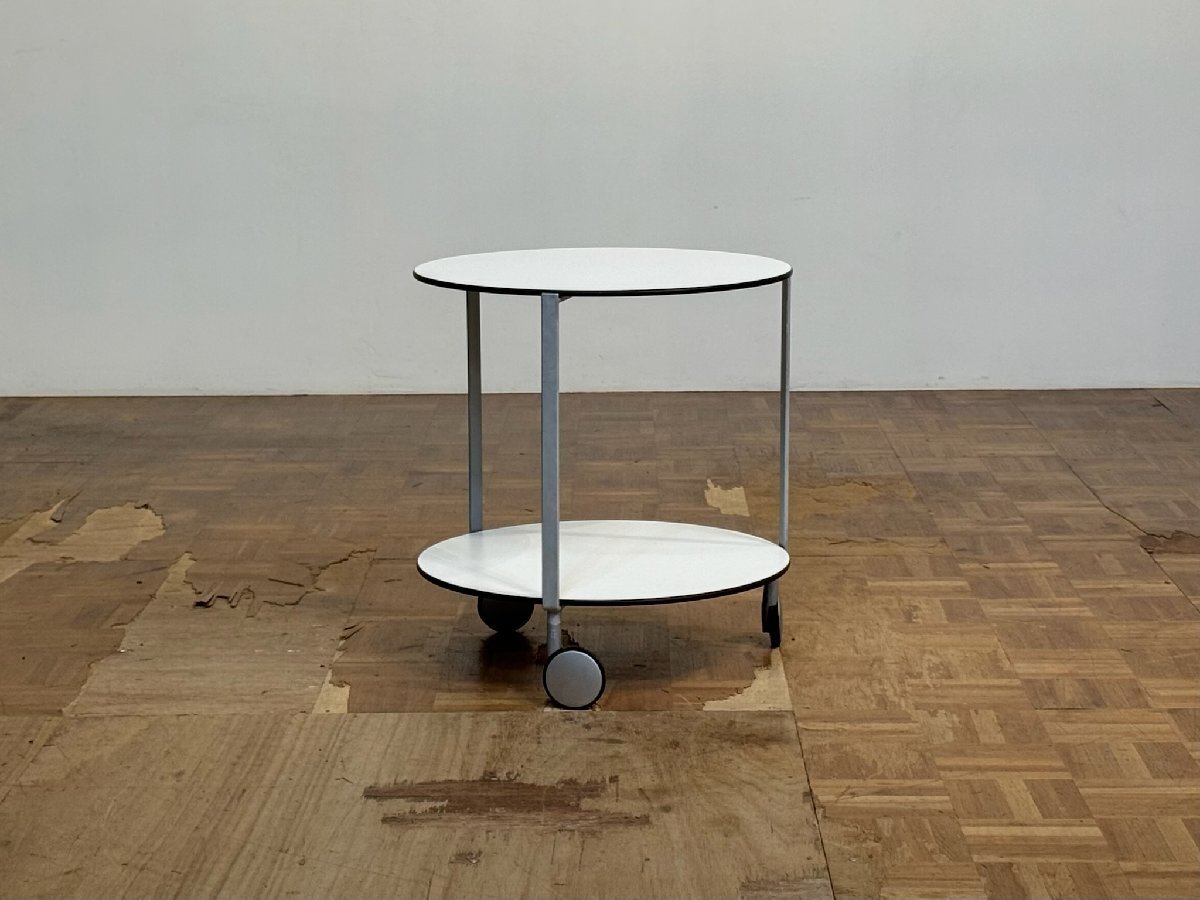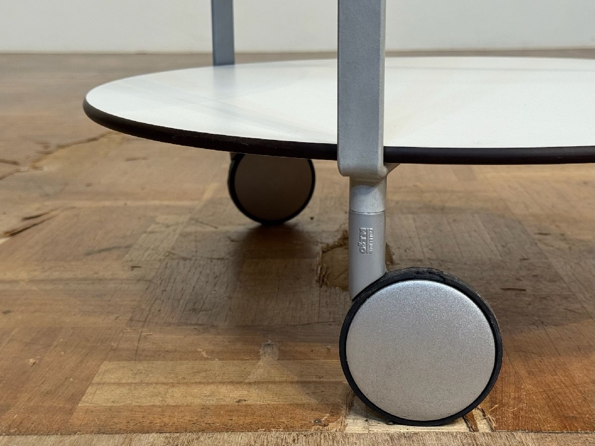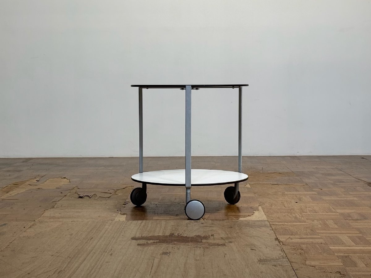 色彩やテキスタイル、素材感の組み合わせに強みを持った女流デザイナー・Anna Deplano / アンナ・デプラノが、連続するふたつの正円トップの浮遊感をグロッシーなガラストップとマットな粉体仕上げを施したほっそりとしたバーフレームの組み合わせで表現し、リビングシーンに小物をインストールする名脇役としてブランドを代表するセラーとしてデザインしたマルチラックサイドテーブル。Zanotta より。1990sヴィンテージ品のご提案。