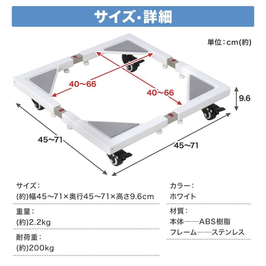 ●洗濯機置き台があれば、洗濯機周辺のお掃除がラクラク♪ いつでも簡単に洗濯機を動かすことができる、キャスター&ストッパー付きの洗濯機置台です。 かさ上げすることで、通気性もよくなり、洗濯機周りを衛生的に保てます。 ●振動パッドで振動を軽減 各コーナーに配置された「振動パッド」が、振動を吸収するので、洗濯時の騒音を軽減してくれます。 ●移動に便利なキャスター 洗濯機置台は移動に便利なキャスター付き。 全てのキャスターにストッパーが付いているので、脱水など洗濯機が揺れる時でも安心。 ●使いやすくてうれしい機能 ・スケール付きフレーム:金属フレーム部分はサビに強く耐久性のあるステンレス製。 1cm単位で目盛り入りで寸法をピッタリ合わせられます。 ・クッションパッド付き:4枚のクッションパッドが付属。 キャスターの下に敷くと床のキズ防止や振動をさらに軽減。 ■商品コード:HD000100 ■商品仕様 サイズ(約):幅45~71cm、奥行45~71cm、高さ9.6cm 重量(約):2.2kg 耐荷重(約):200kg カラー:ホワイト 材質:ABS樹脂(本体)、ステンレス(フレーム部) ■注意事項 ・平坦かつ水平な場所に置いてご使用ください。 ・商品の上に乗ったり、踏み台等に使用しないでください。特にお子様には使用させないよう十分ご注意ください。 本商品は洗濯機の土台として開発されております。 ・パイプは緩んでいないか定期的に確認してください。緩んでいる場合は再度固定ネジを締め直してください。 ・直射日光やストーブなどの熱は避けてください。変色、変形の原因となります。 ・洗濯機は土台の中心にしっかりとのせてください。 ・移動させる時以外はキャスターのストッパーをかけておいてください。思わぬ事故の原因となります。 ・汚れをとる時は、乾いた布で拭き取ってください。 ベンジーやシンナーに使用は変色、変形の原因となりますので絶対におやめください。 ・重量がありますので十分に注意して起こしてください。 ・脚を軸にして起こしますと事故、破損の原因となる可能性があります。 商品を起こす際は持ち上げて起こすようにしてください。 ・商品は、モニターによって色合いが異なって見える場合があります。 ・仕様・デザインは改良のため予告なく変更することがあります。 ■保障期間 7日間 ※商品到着後7日以内の初期不良・破損のみご対応させていただきます。 【新品未使用品です】 |