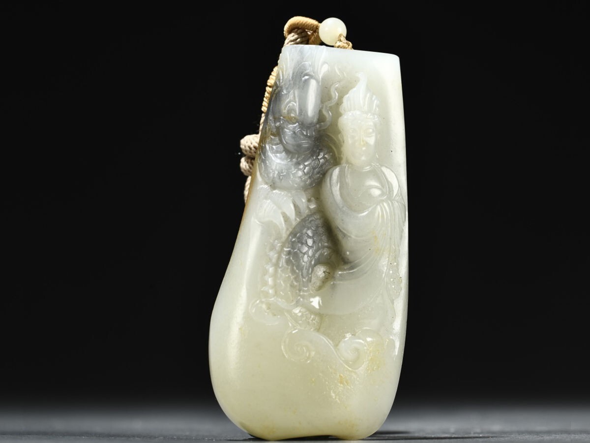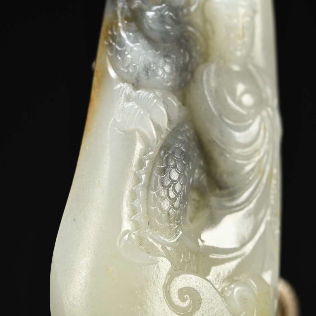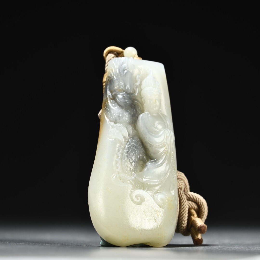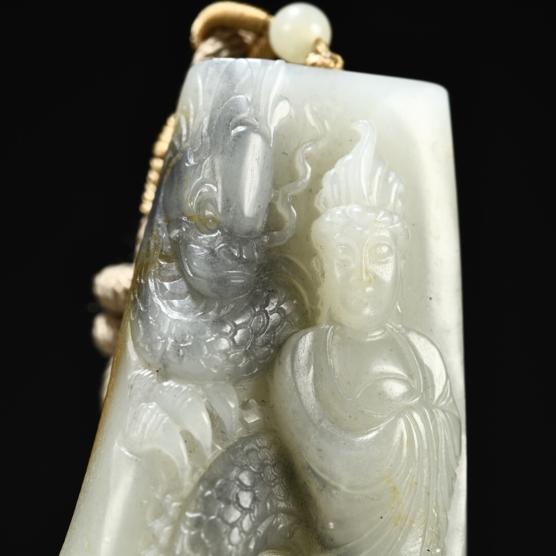 【瓏】和田玉 青花子料彫 御龍観音 掛件 清時代 極細工 手彫り 置物 裝身具 賞物 中国古美術 蔵出