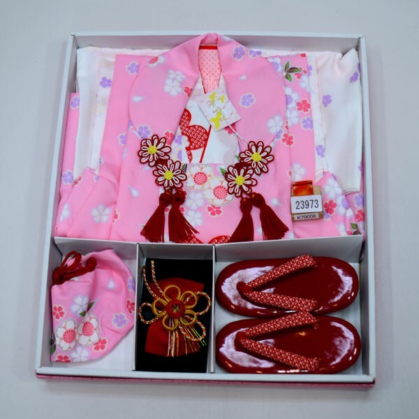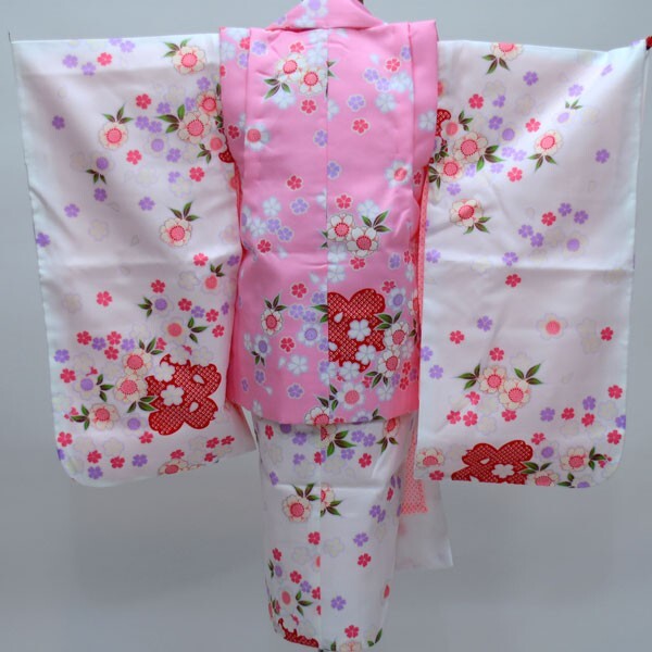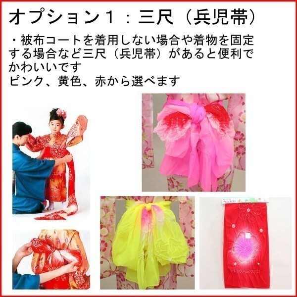 項目 | 三歳被布着物フルセット ・着物 ・長襦袢 ・被布コート・巾着 ・髪飾り ・草履・伊達衿(縫い付済) ・付け紐2本(着物縫付済) ・着付け説明のご案内(ご要望のお客様のみ、詳しくは以下明記しております) 以上フルセット |