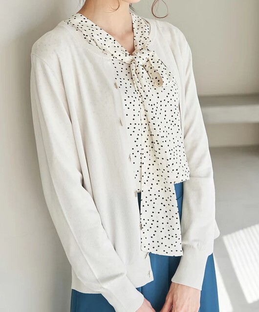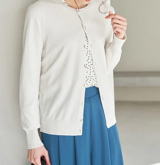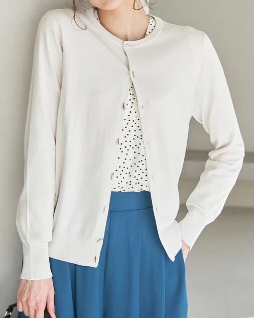 ・シンプルに着回せる、クルーネックの長袖ニットカーディガン。