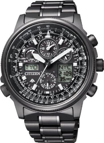 ■アナログ&デジタル高機能パイロットウオッチのデュラテクトDLCモデル。SKYシリーズのコンセプトはそのままに、シチズン独自の技術であるデュラテクトDLCの価値をプラス。軽くて肌に優しいチタニウムボディは、MRK+DLCコーティングを施すことでキズ付きにくくなっています。