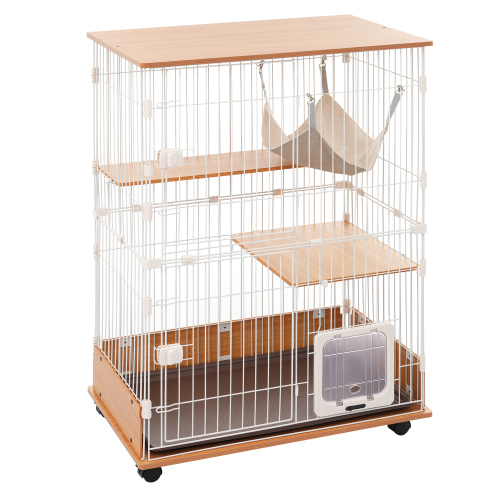 猫 キャットケージ 木製 二段 ナチュラル 1段2段可能 キャスター付 キャットハウス留守番 保護 脱走防止 多頭飼い