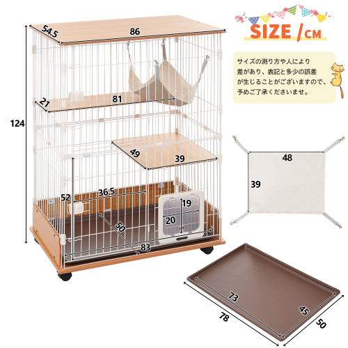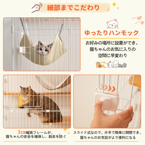 • 【広い棚板でのびのびリラックス】 二種類サイズの棚板があり、猫ちゃんが上り下りしやすい。サイズも十分あるので、棚板に猫ベッドおもちゃなども置けます。ケージから棚板を出せるので、掃除に便利です。 ※棚板の耐荷重は10kgで、大型猫や多頭飼いでも安心!