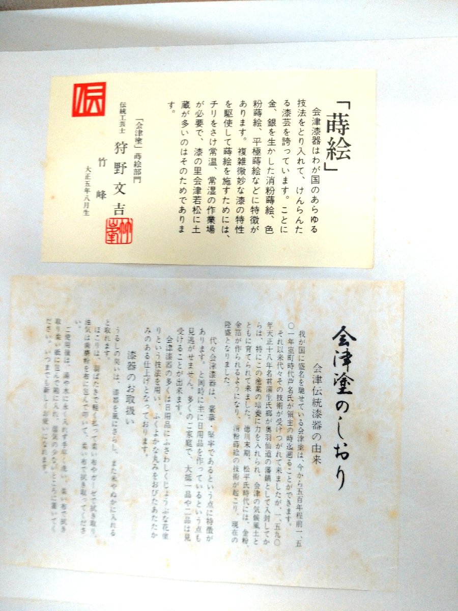 | ◆商品説明◆ | 会津塗 松道謹製 狩野文吉作 三段本重 天然木 未使用品 箱付です。 会津塗の非常に美しい重箱です。 サイズは下記の通りとなります。 20(縦)×20(横)×19(高さ)cm 未使用品の為奇麗な状態です。 撮影の為に開封のみ致しました。 | |