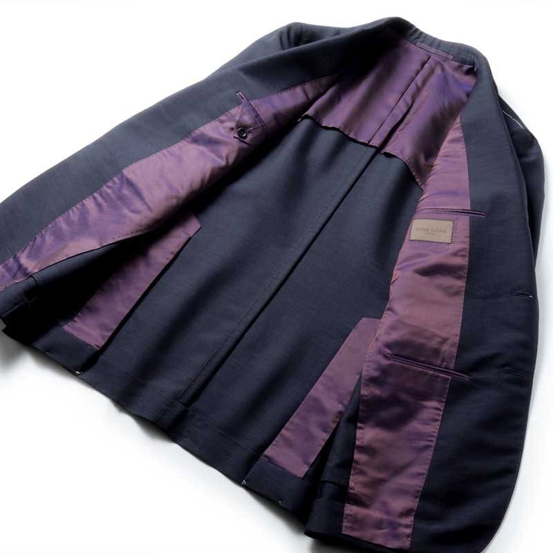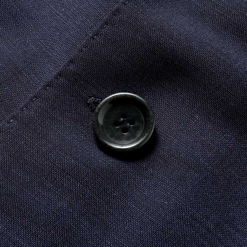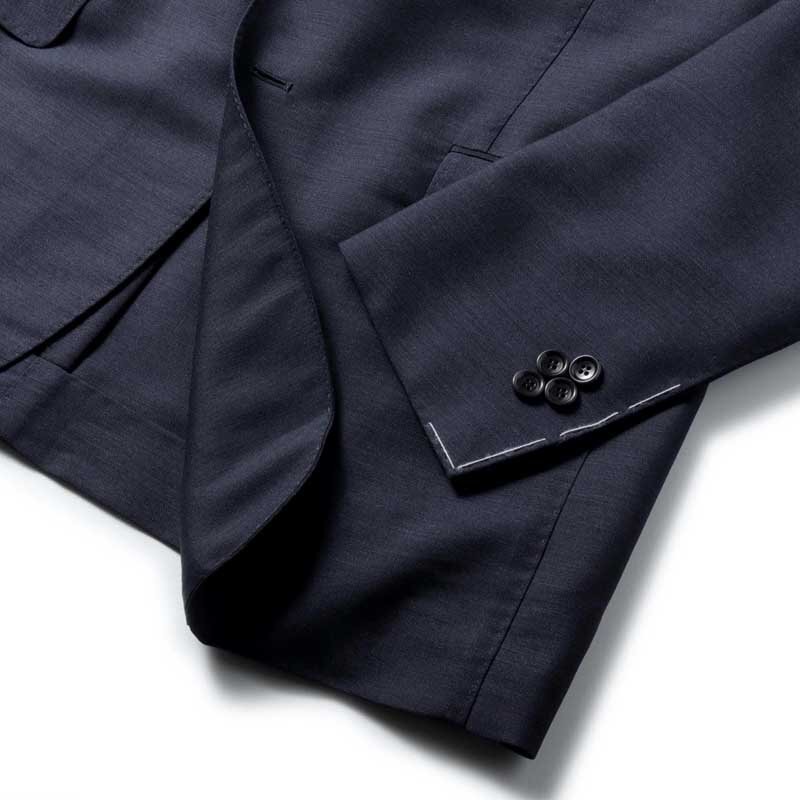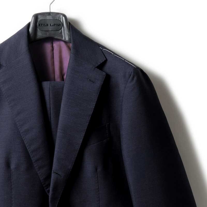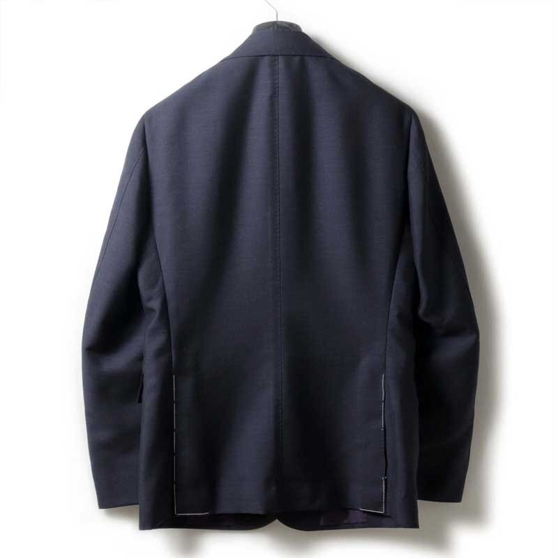 ・肩から首にかけての吸い付くようなフィット感の美しいのぼり、立体的でふんわりと仕上がったふくらみのあるラペル、ナチュラルな弧を描く前振り袖、ウエストが程よくシェイプされた美しいシルエット、上質な芯地を使用した柔らかなショルダーライン(マニカカミーチャ)など、伝統的なナポリ仕立てをベースにハンドを駆使してつくられています。