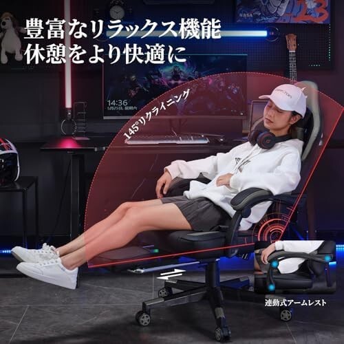 【多機能チェア】当社のゲーミングチェアは、背もたれを145°まで無段階で調整できる機能を備えています。さらに、収納可能なフットレスト、連動式肘掛け、上下7.5cmの昇降範囲、360°スムーズな回転を備えており、様々な姿勢での座り方をサポートします。仕事中やゲームプレイ中、リラックスして休息する際にも、自分に最適な座り方を見つけることができます。1つで様々な使い方ができる理想的な椅子として、仕事、ゲーム、休憩モードの切り替えが簡単です。