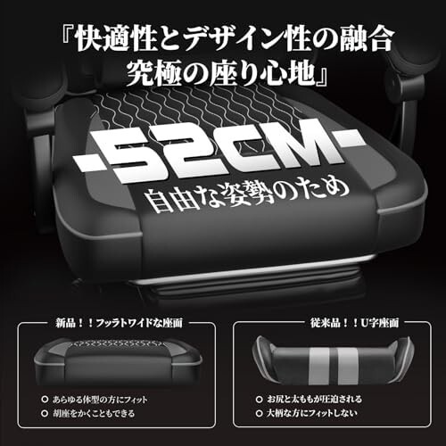 • 【広々とした平らな座面で快適な座り心地を実現】このゲーミングチェアは、座面の幅が52cmと少し大きめで、ゆとりある設計が特長です。伝統的なU字座面を改良し、両サイドを削って平らなデザインになっています。両足を広げても引っかからず、痛みを感じません。あらゆる体型の方にフィットします。体格の小さい方はそのまま座って胡座をかくこともでき、大柄な方はオットマンを利用して胡座をかくことも可能です。体重が均等に分散され、圧力が軽減されるため、疲労感が和らぎ、最も快適な座り心地をお楽しみいただけます。