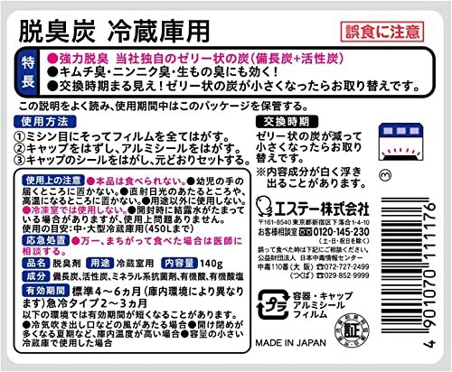 「[ 脱臭炭 冷蔵庫用 ]【まとめ買い】 冷蔵庫 脱臭剤 140g×3個 備長炭パワー (キムチ臭 ニンニク臭 生もの臭に) キッチン レギュラー」▼4904740600475▼(商品説明)・ブラック 3個 ・・PatternName:レギュラーSize:3個・【脱臭炭を冷蔵庫に入れよう】冷蔵庫の気になるニオイを備長炭と活性炭の力でしっかり脱臭。・【キムチ臭ニンニク臭にも効く】冷蔵庫用処方。生もの臭にも効く。・【ゼリー状の炭が小さくなったらお取り替え】交換時期が簡単に分かります。・【用途】脱臭剤 冷蔵室用・【原産国】日本説明 商品紹介 ●本品は食べられない。 ●万一、まちがって食べた場合は医師に相談する。 ●幼児の手の届くところに置かない。 ●直射日光のあたるところや、高温になるところに置かない。 ●用途以外には使用しない。 ●冷凍室では使用しない ●強力脱臭 ツンとくる臭いにも効く(強化備長炭+活性炭)●ミネラル抗菌パワー(ミネラル系抗菌剤配合)※ゼリー面に付着した菌の活動を抑えるです。●交換時期が分かる(当社独自の小さくなるゼリー状の炭)●生もの臭に効く(ミネラル脱臭パワー) 【有効期間】 標準4~6ヵ月(庫内環境により異なります)急冷タイプ:2~3ヵ月 以下の環境では有効期間が短くなることがあります。 ●冷気吹き出し口などの風があたる場合 ●開け閉めが多くなる夏期など、庫内温度が高い場合 ●容量の小さい冷蔵庫で使用した場合・原材料・成分 活性炭、備長炭、ミネラル系抗菌剤、有機酸