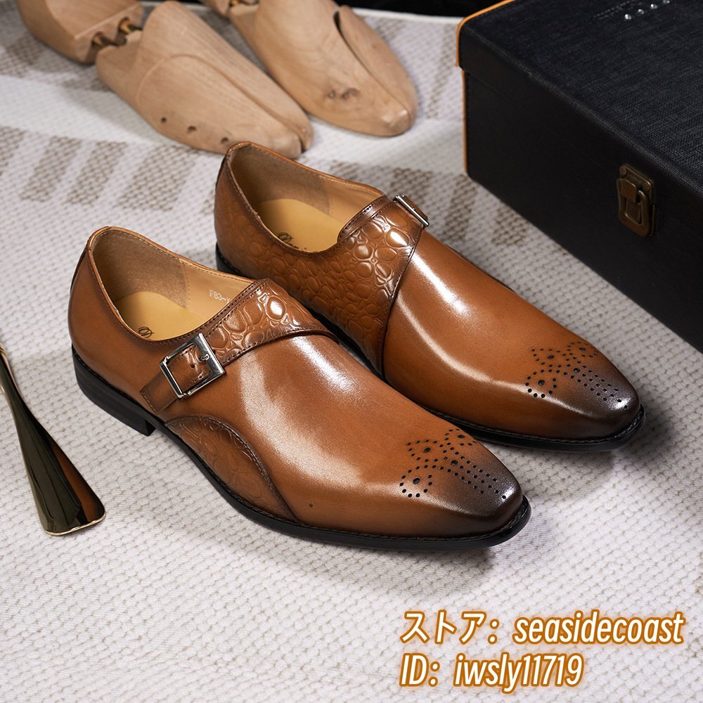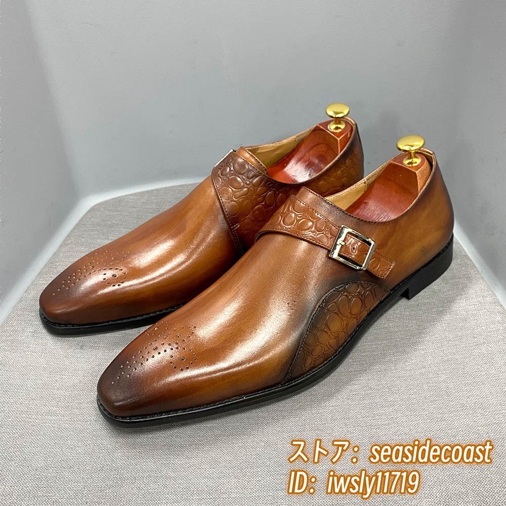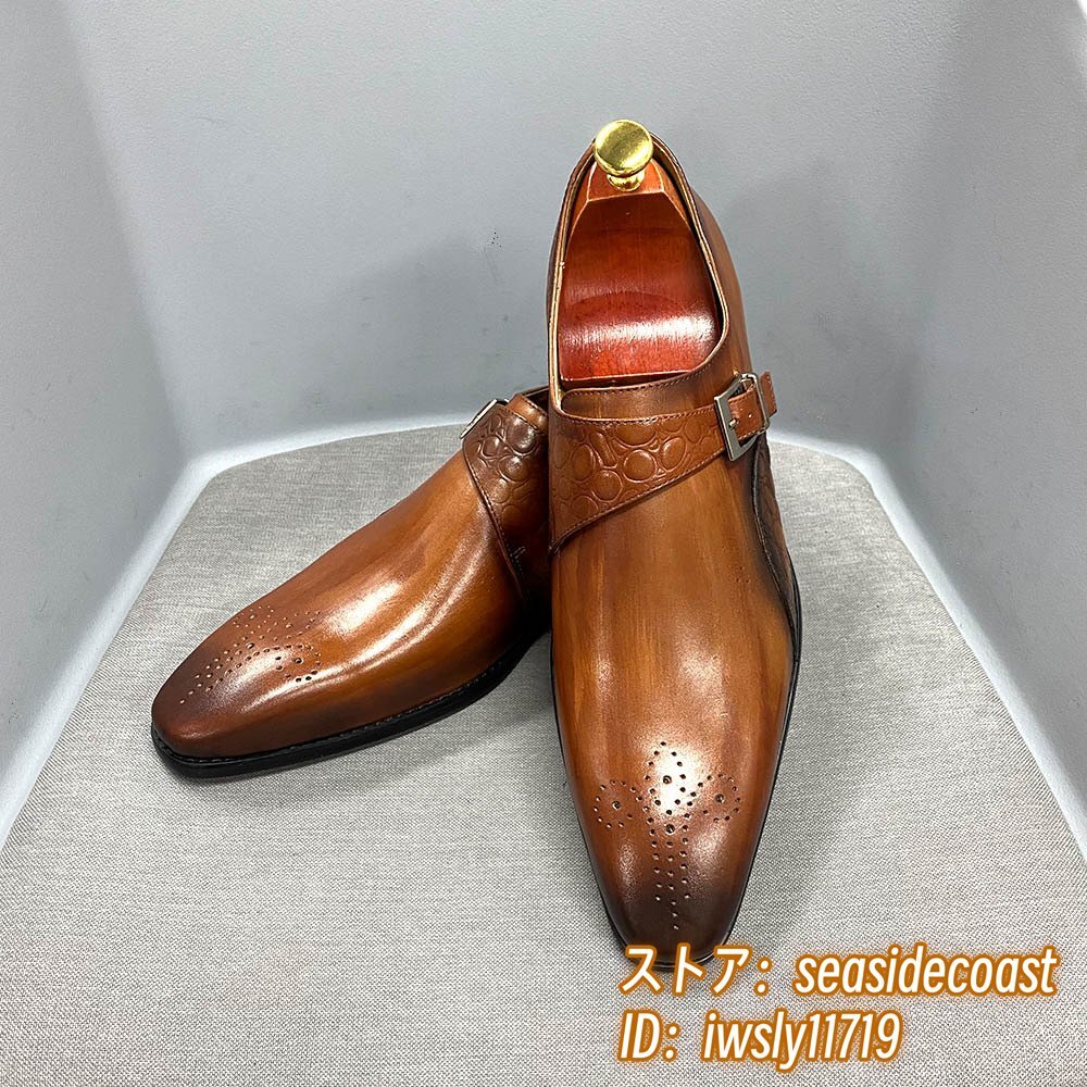 最高級★定価11万 ビジネスシューズ 本革 メンズ 職人手作り 彫り モンクストラップ レザーシューズ 牛革 紳士靴 革靴 ブラウン 24.5cm