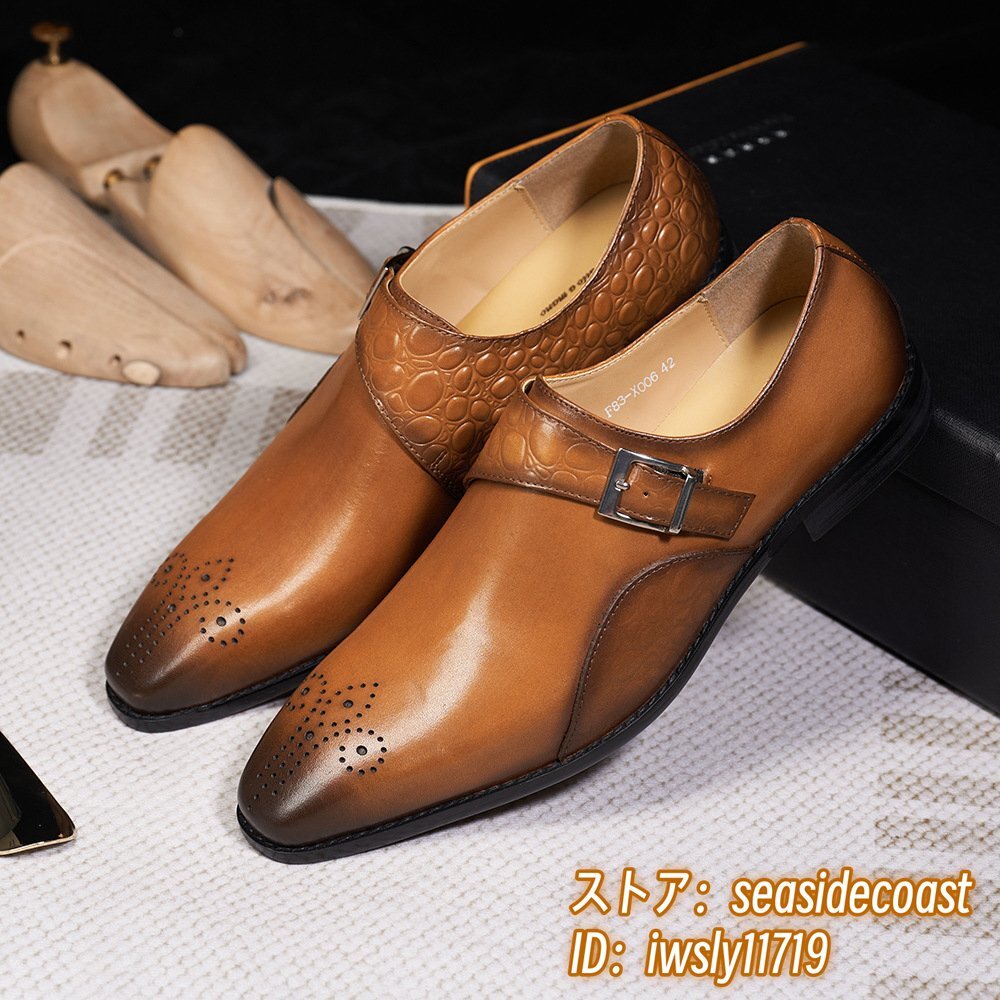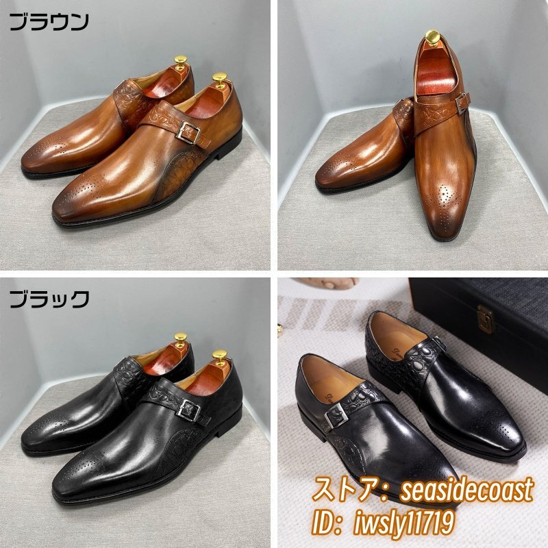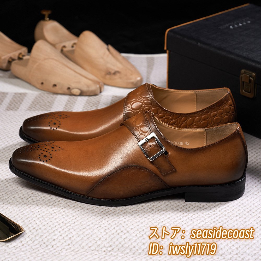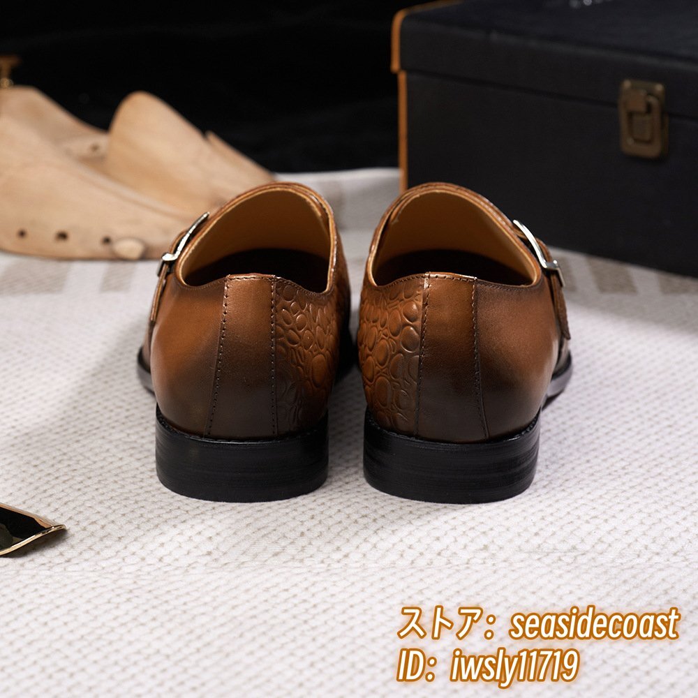最高級★定価11万 ビジネスシューズ 本革 メンズ 職人手作り 彫り モンクストラップ レザーシューズ 牛革 紳士靴 革靴 ブラウン 24.5cm