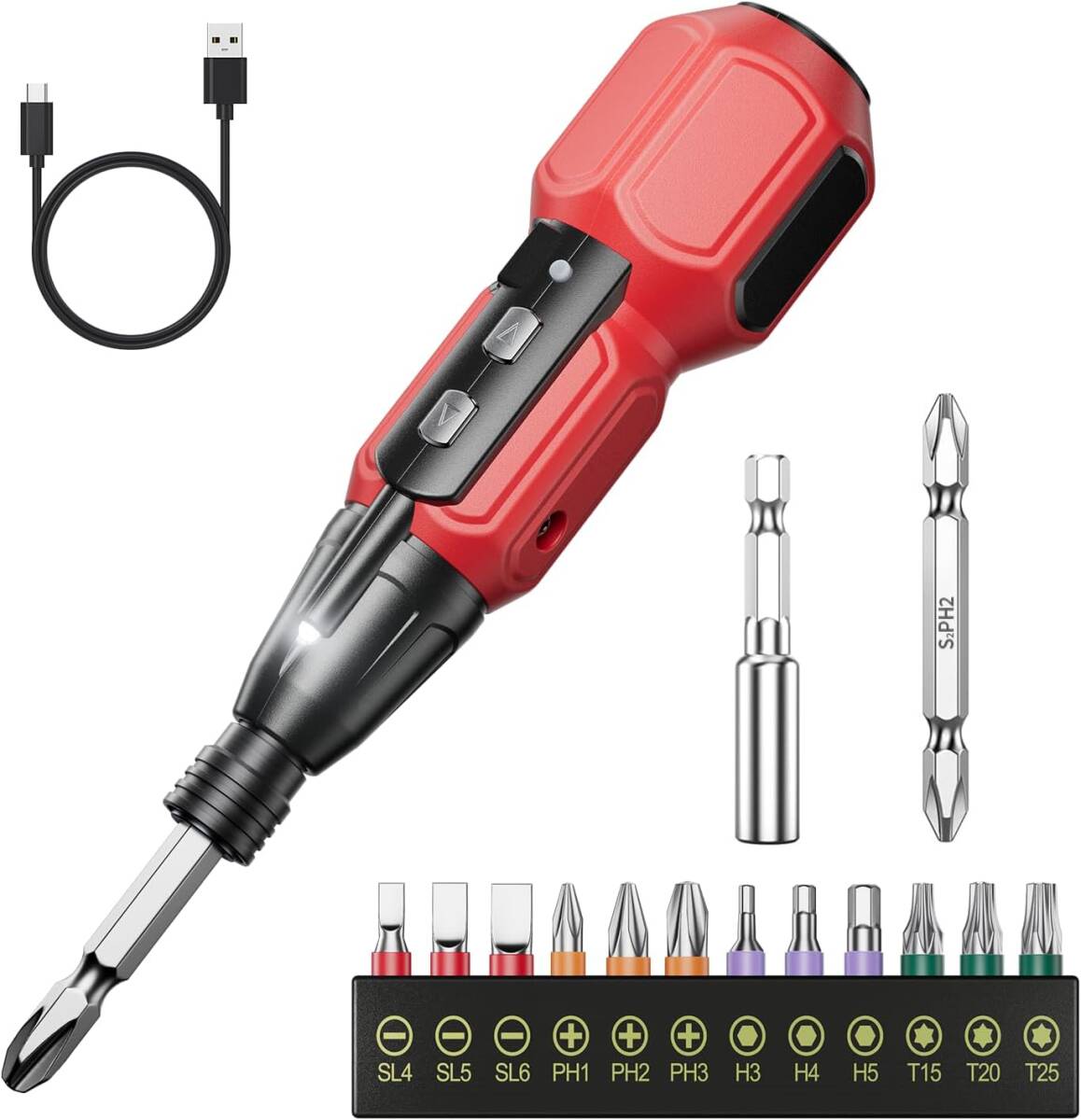 【高品質合金ビット・フルセットS2工業規格】本ドライバーのビットセットは、S2工業規格に準拠した高硬度・高強度合金を採用。破損リスクを排除しました。14本の交換用ビット付属でSL4/SL5/SL6/PH1/PH2/PH3/H3/H4/H5/T15/T20/T25など多様なネジに対応。家庭内のあらゆる作業ニーズをカバーします。ビットホルダーには磁気吸着機能を内蔵し、精密な位置決めと落下防止を実現。磁力式ビットチェンジシステムを採用:スライド式マグネット機構でワンタッチ装着作業中のビット脱落を防止女性や高齢者でも確実に交換可能。