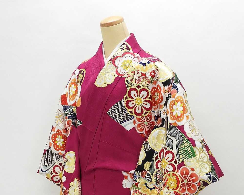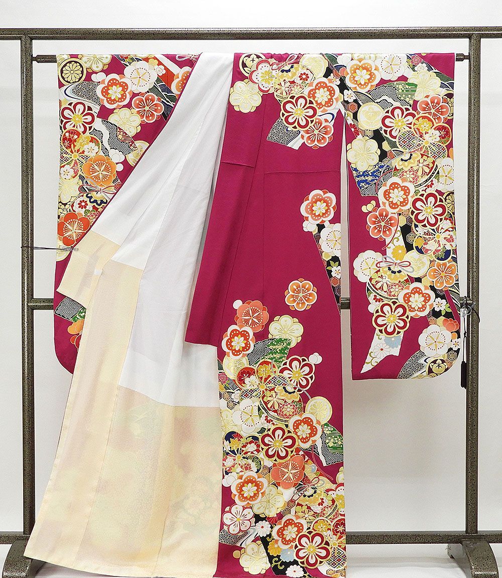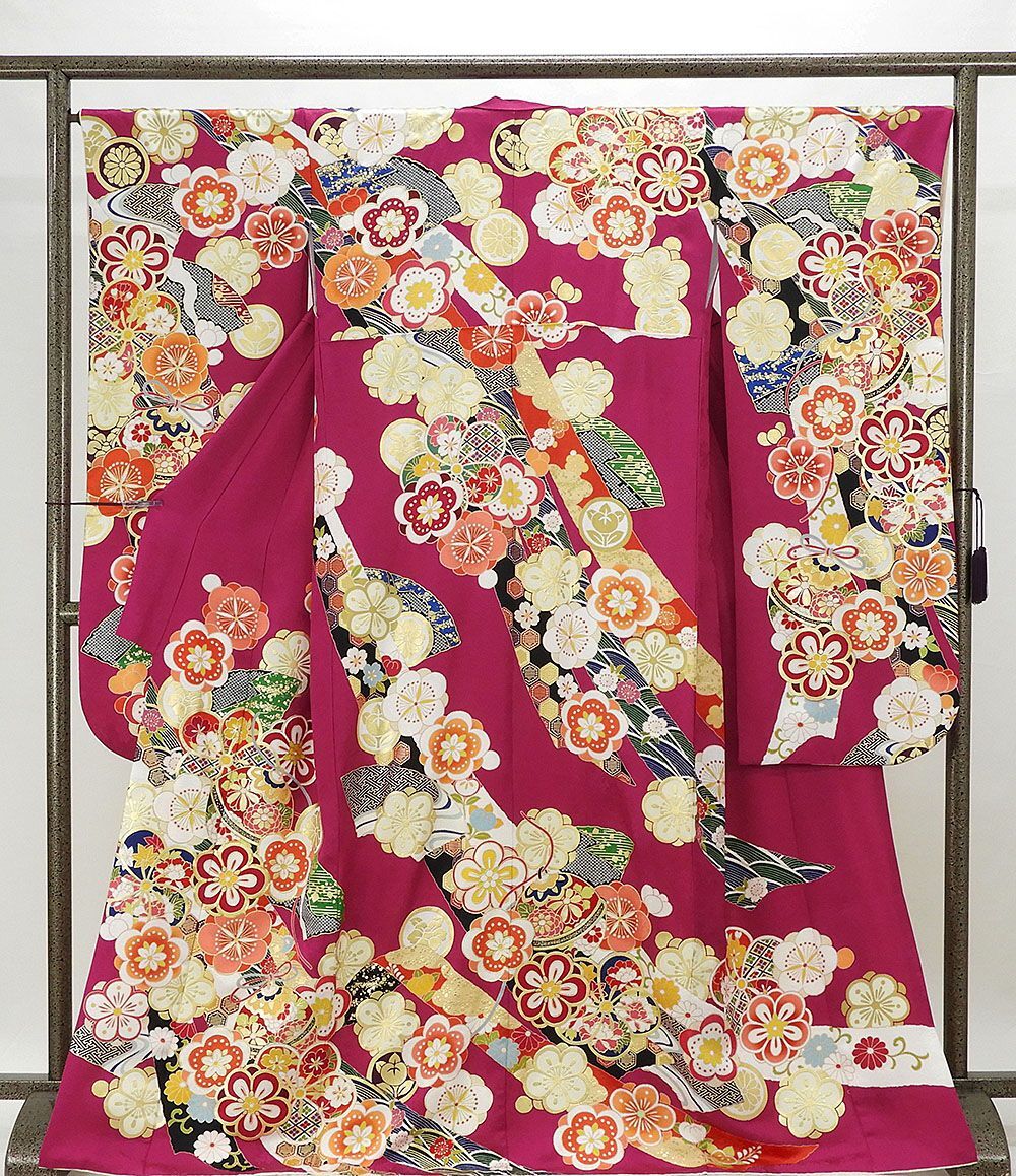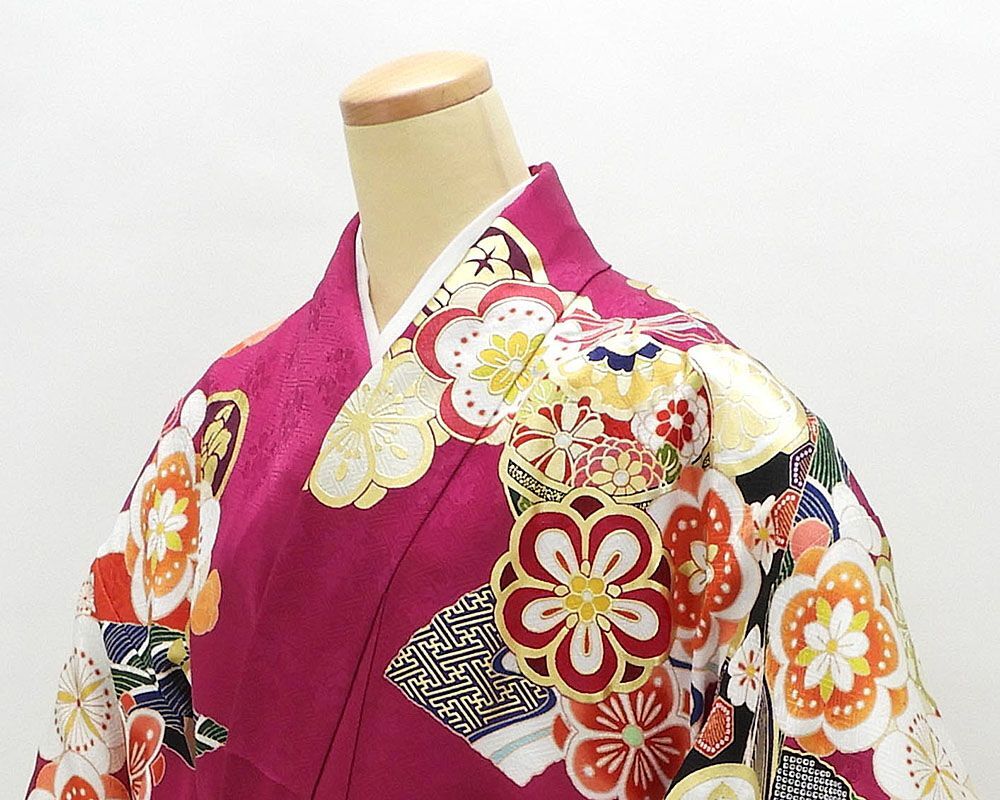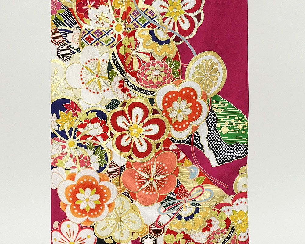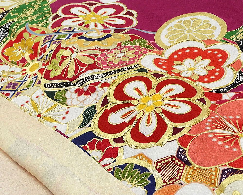 草葉鞘型地紋のマゼンタ色地に紅赤やオレンジ・グリーンなどの多色や金箔・金駒で四季花手毬模様が柄付けされています。