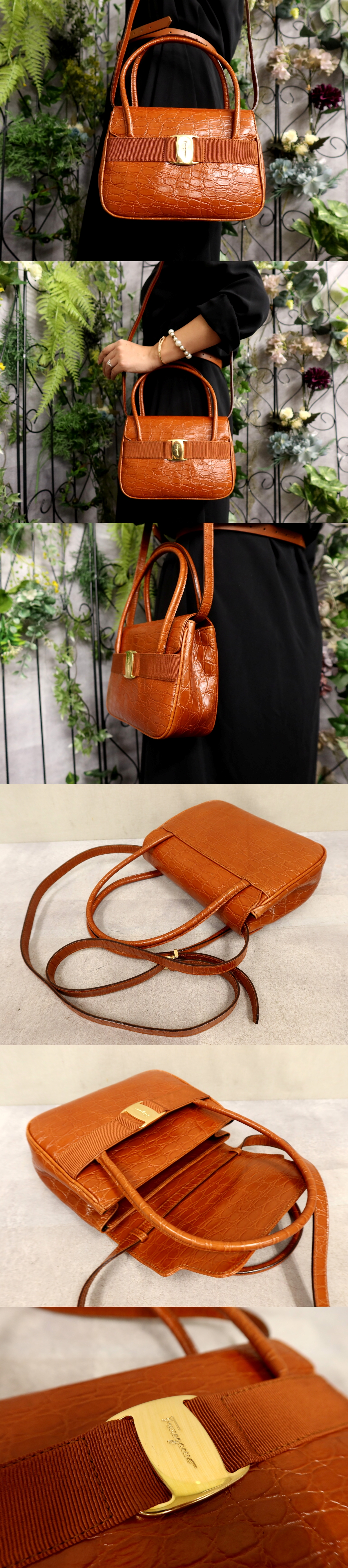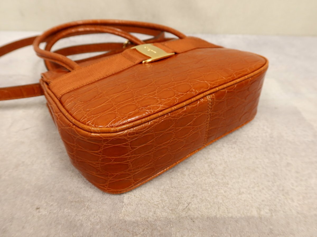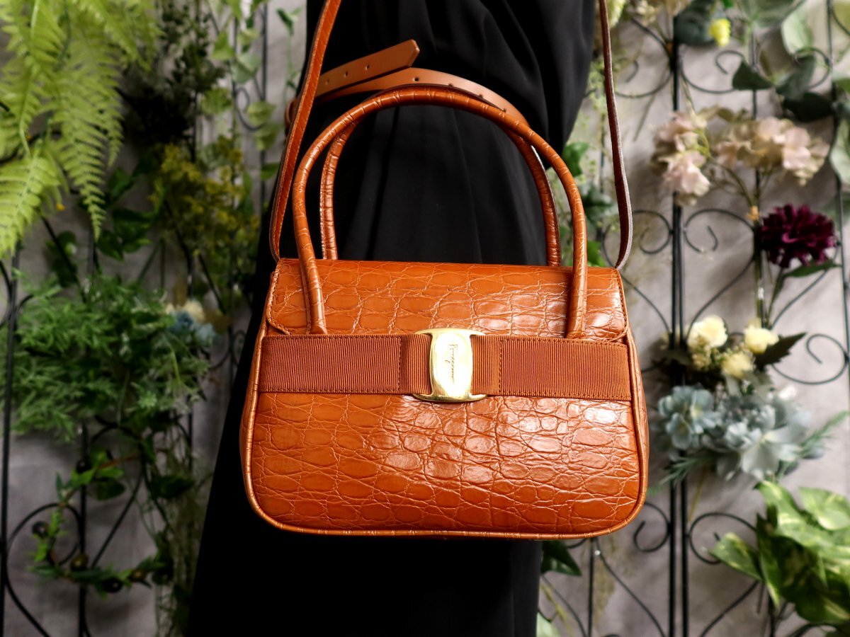 ●超美品●フェラガモ●ヴァラ●ガンチーニ●クロコダイル 型押し レザー 本革●2way ハンド バッグ●コニャックブラウン●G金具●Js60971