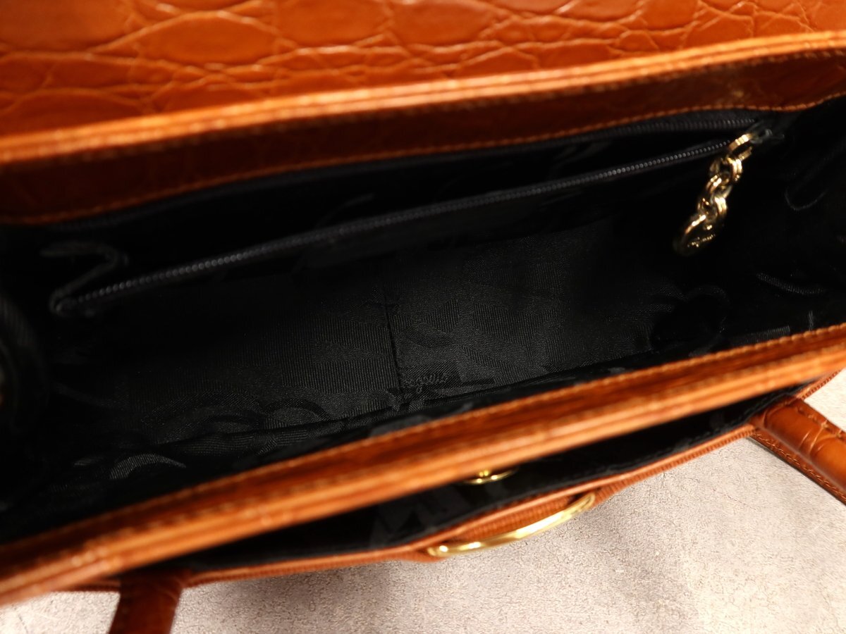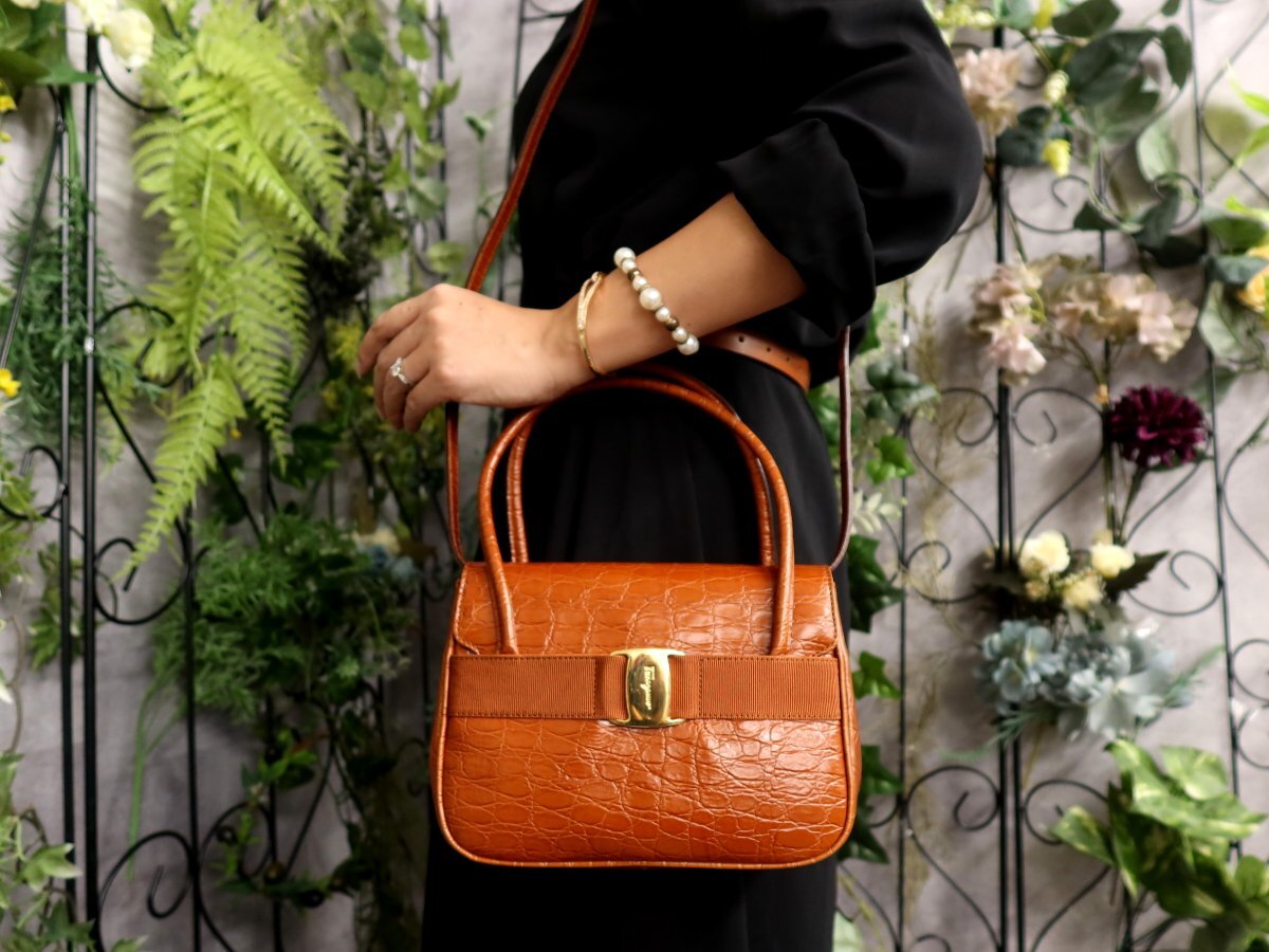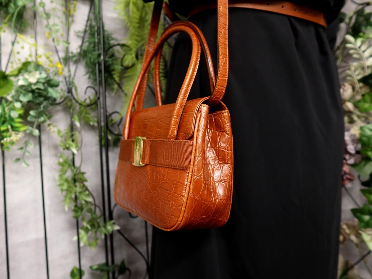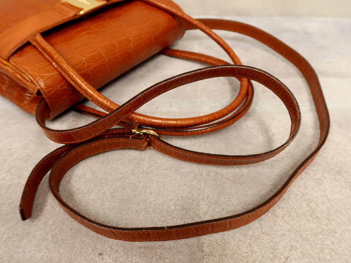 ●超美品●フェラガモ●ヴァラ●ガンチーニ●クロコダイル 型押し レザー 本革●2way ハンド バッグ●コニャックブラウン●G金具●Js60971
