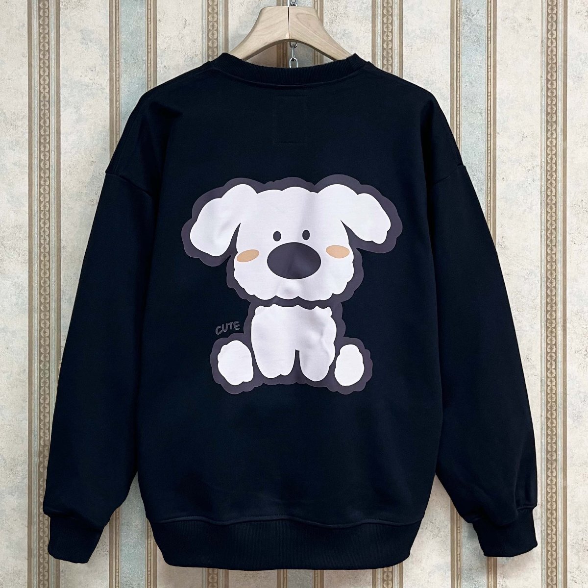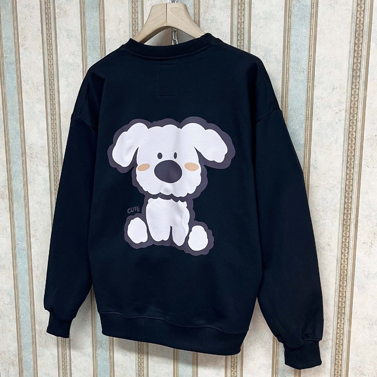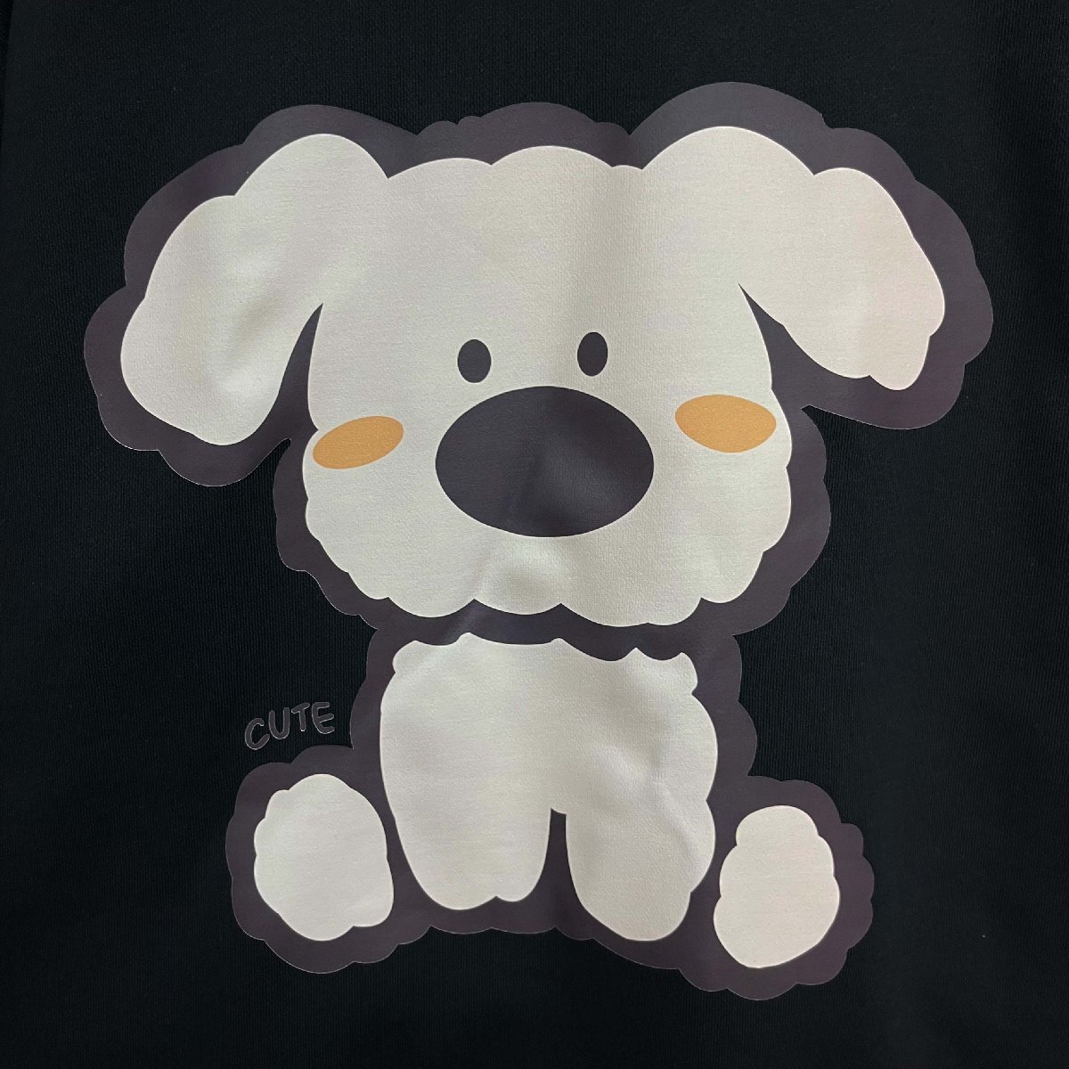 デザインは、フロントはあえて無地でシンプルに。清潔感があり、どんなボトムスとも相性抜群です。背面には、愛らしい犬のプリントを大胆にあしらい、後ろ姿でさりげない個性を演出。クールな印象の中に遊び心を感じさせる、絶妙なバランスのデザインに仕上がっています。