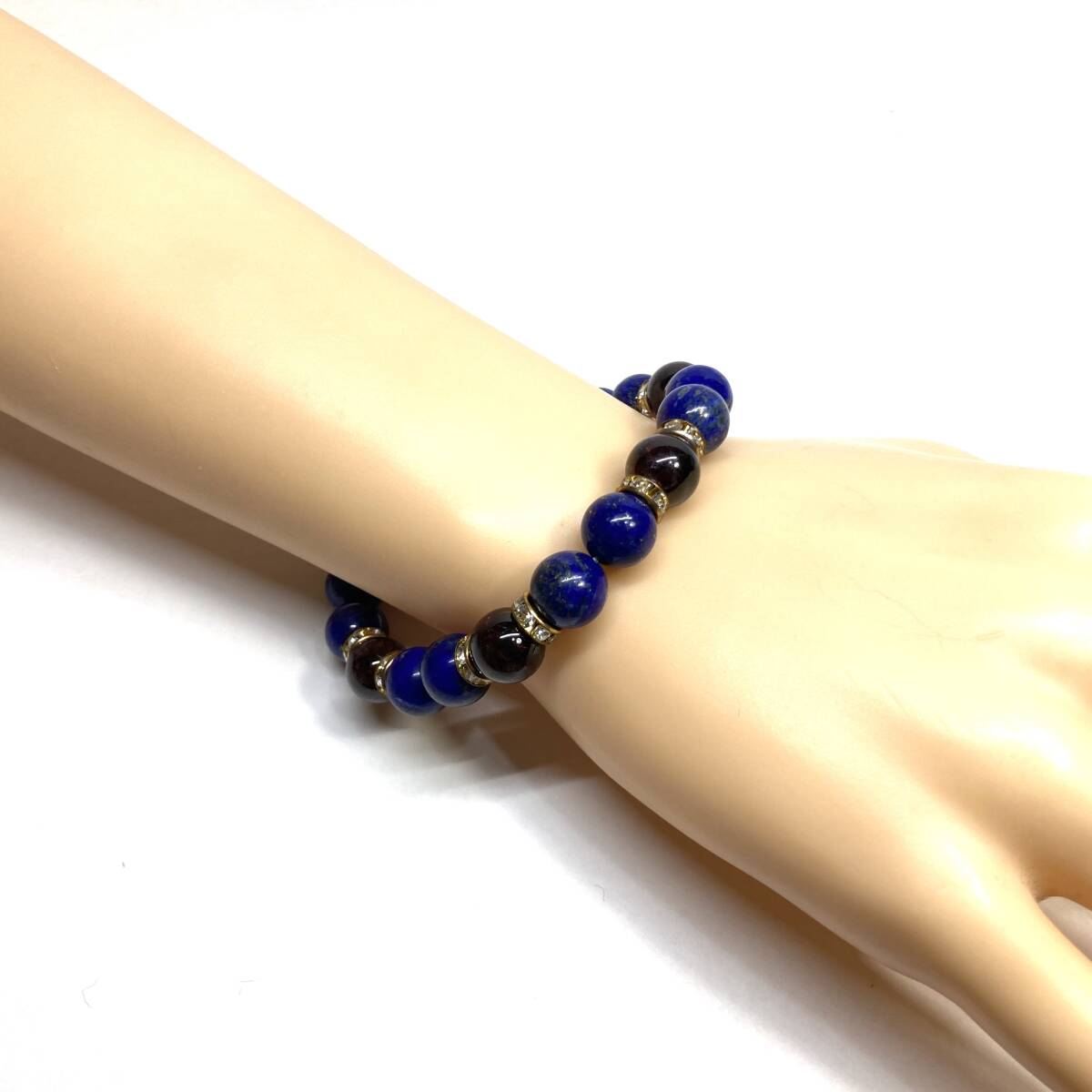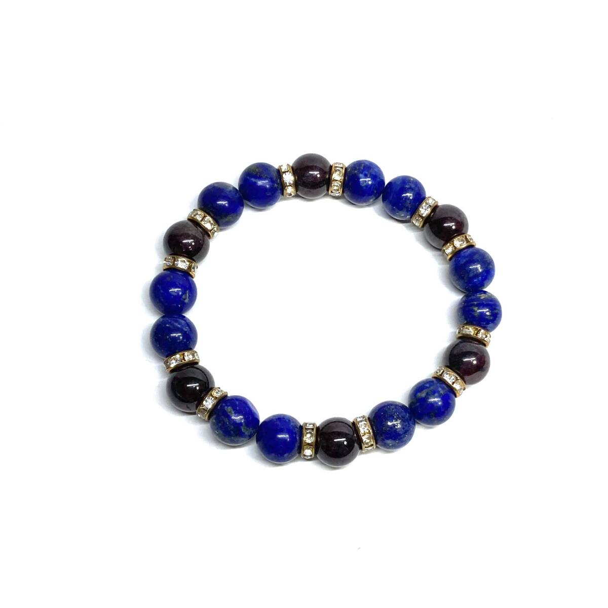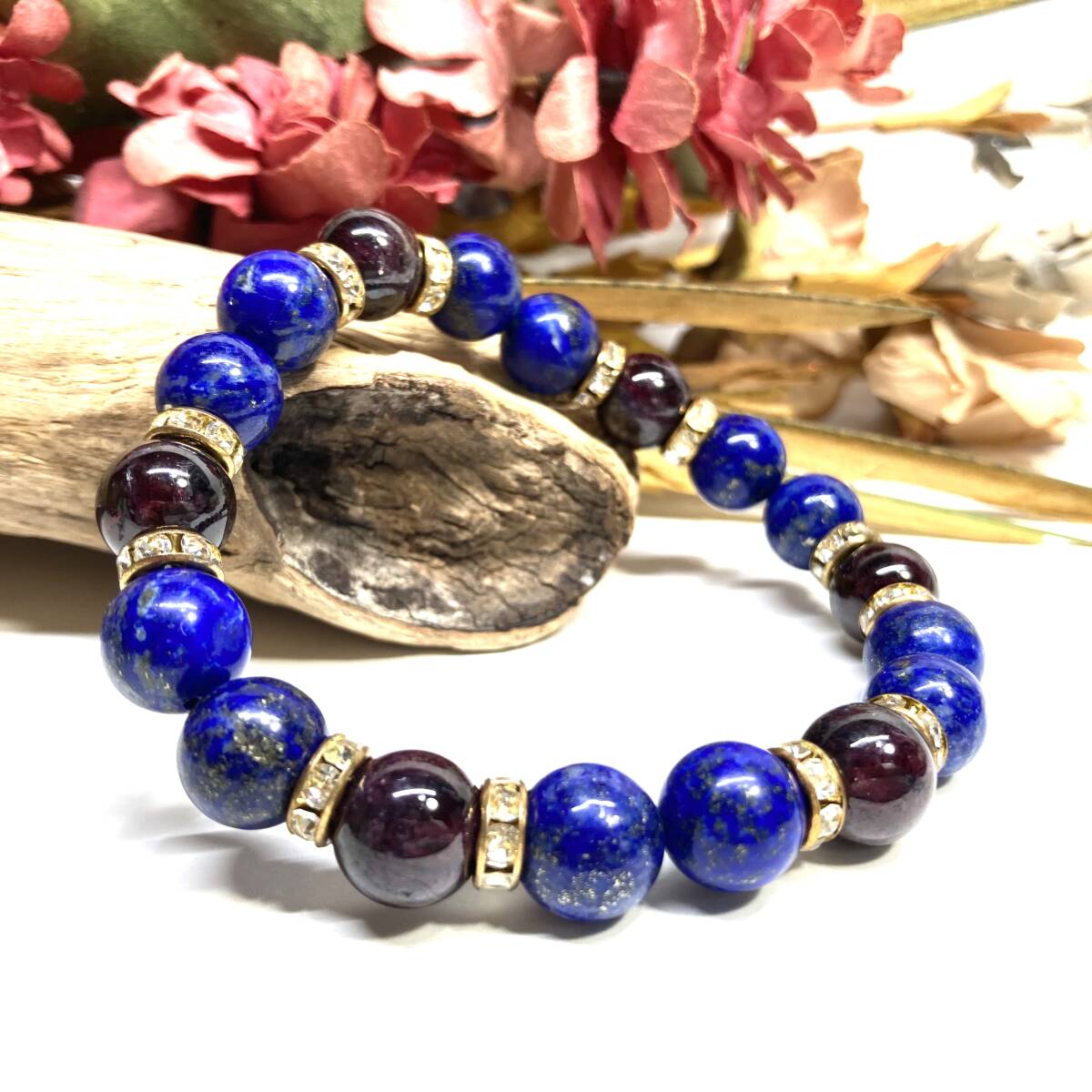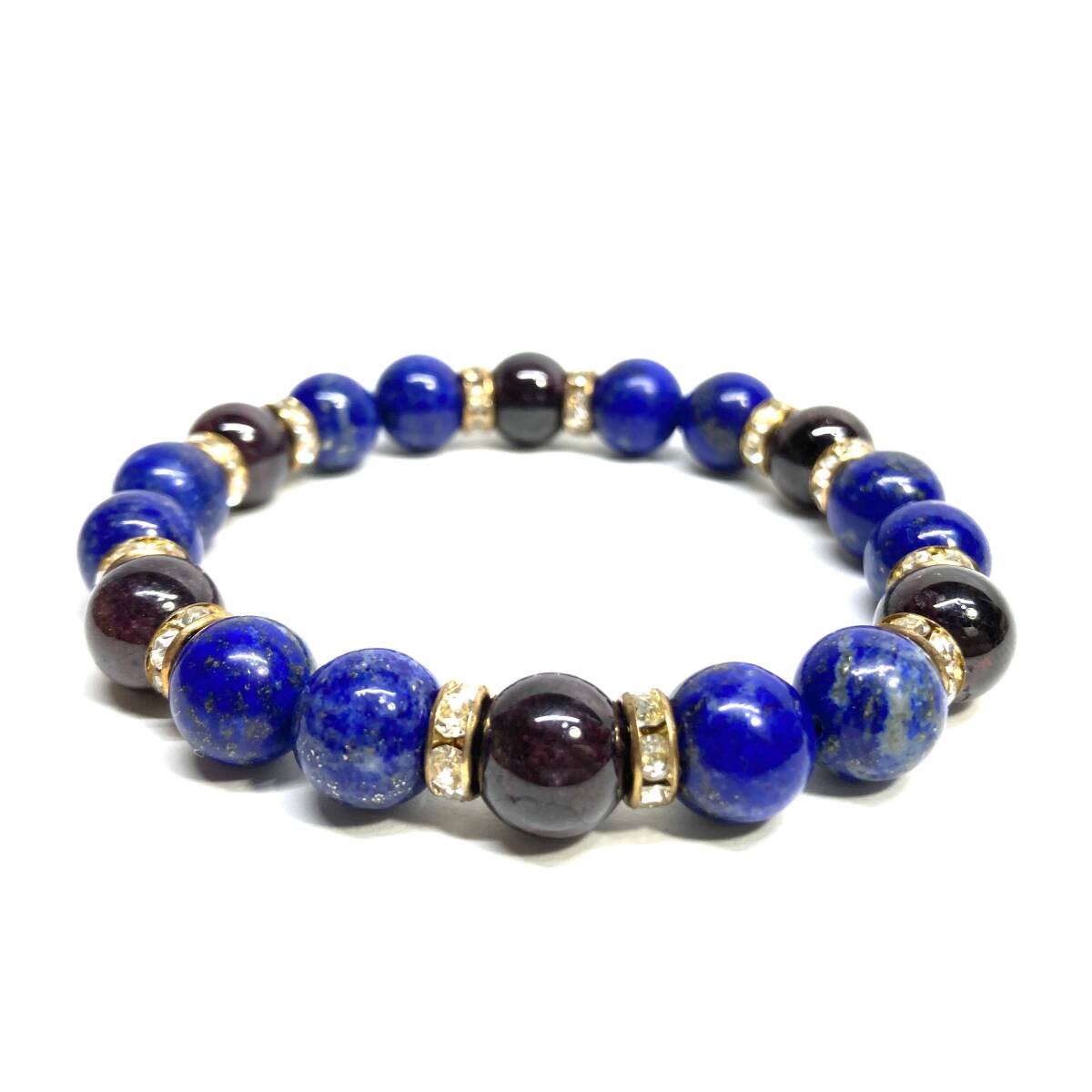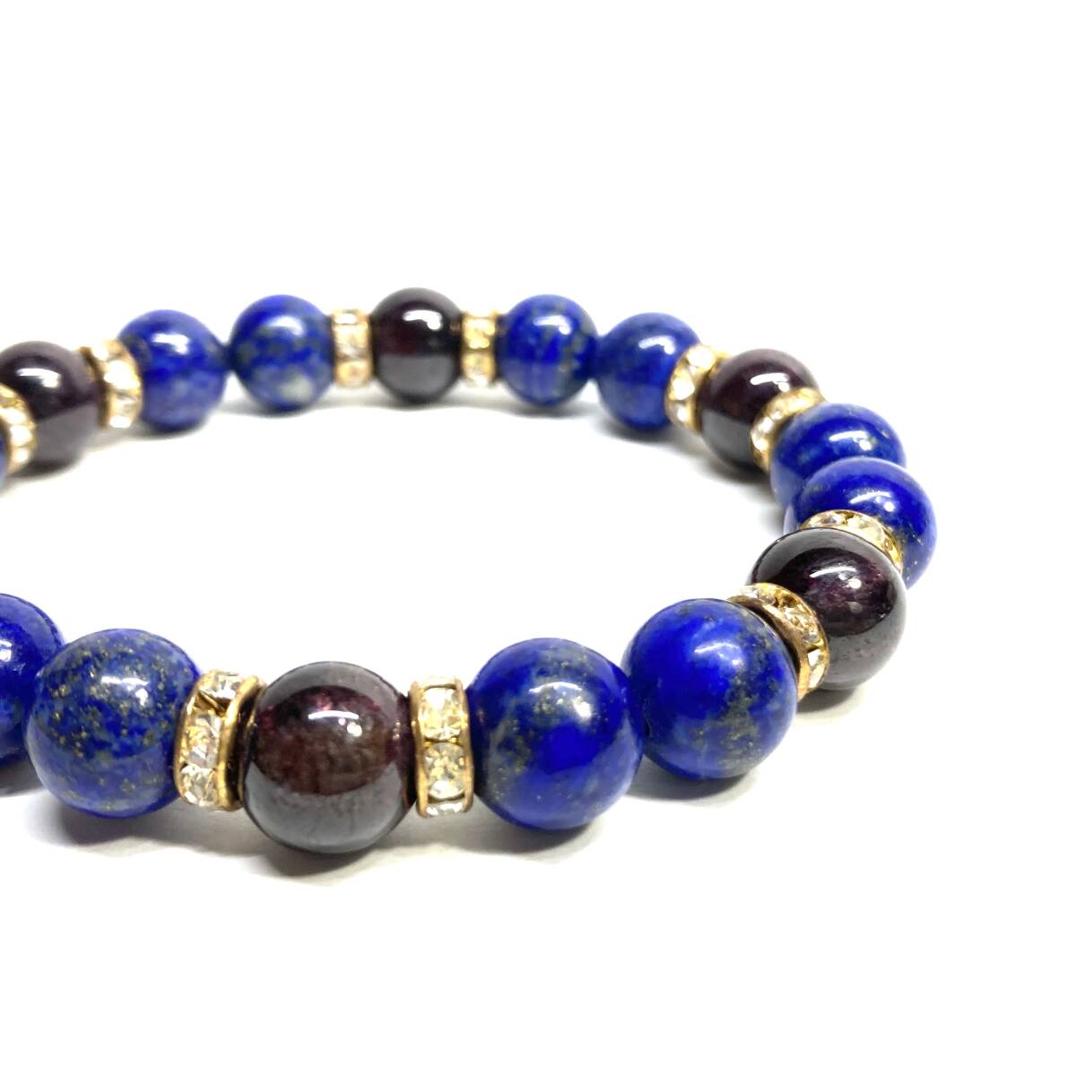 こちらは、ラピスラズリとガーネットを組み合わせたパワーストーンブレスレットです。間にはロンデルを挟み高級感あるデザインに仕上げております。石大きさは腕にも馴染みやすいように10mm玉で内径約18cm(伸可能)です。(サイズ変更の場合は取引ナビにてご連絡をお願いします。) 数に限りがございますので気になる方はお早めにどうぞ。