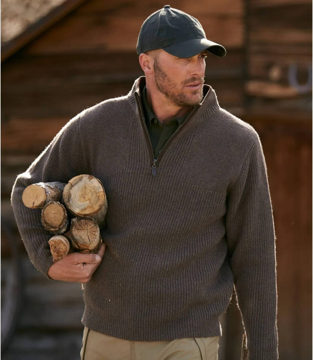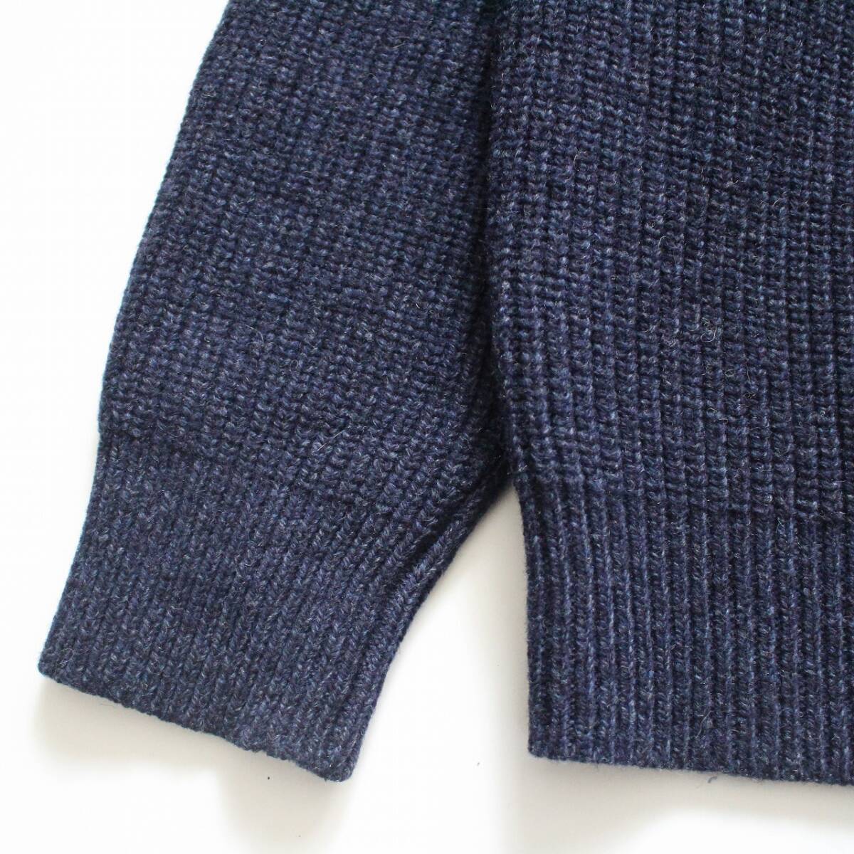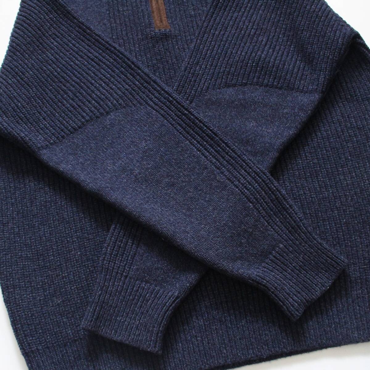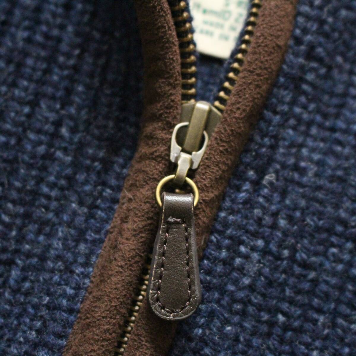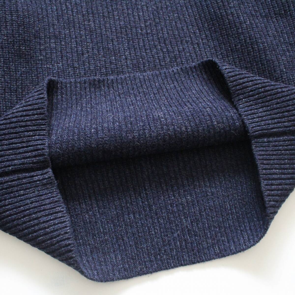 やや厚手のメリノウールニットで、襟の内側は首に優しいポリエステル製マイクロスウェード素材、