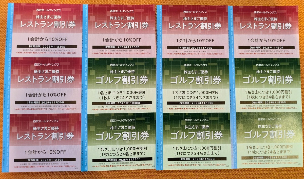 西武ホールディングスの株主優待ゴルフ割引券6枚、レストランセット割引券6です。