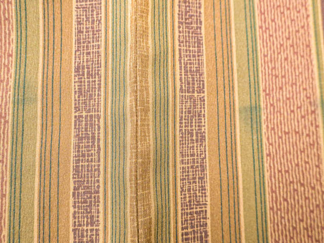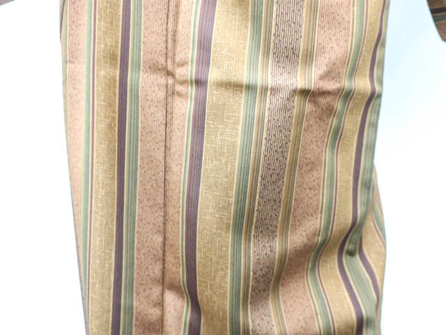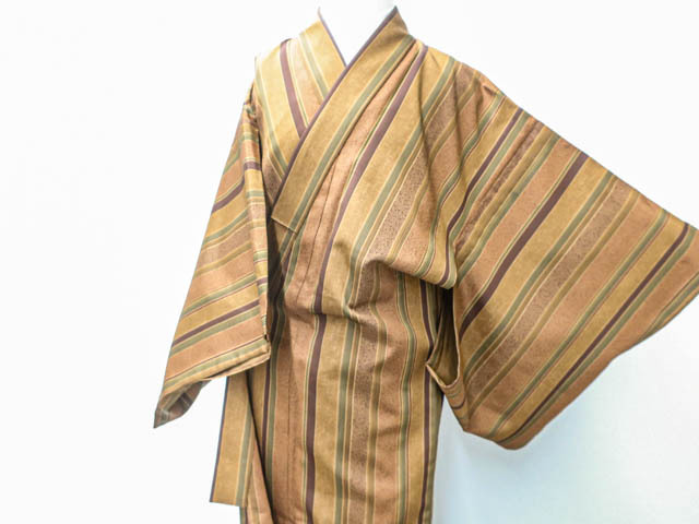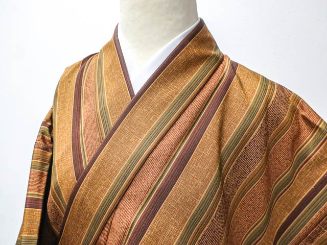 リサイクル商品のため、脇縫いの糸にゆるみ、染色にじみがございますが着用可能なお品です。 バチ衿でございます。 地色は、茶色です。 1枚目の画像が近いお色かと思われます。 素材は化繊です。 |