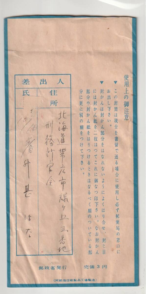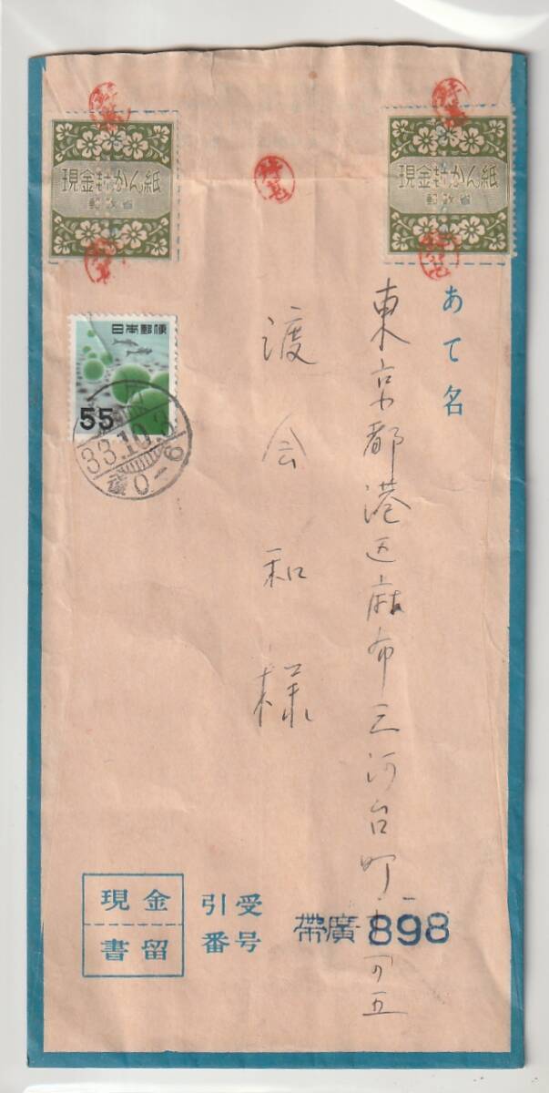 ◆エンタイア◆55円旧マリモ 櫛型印 帯広 現金書留