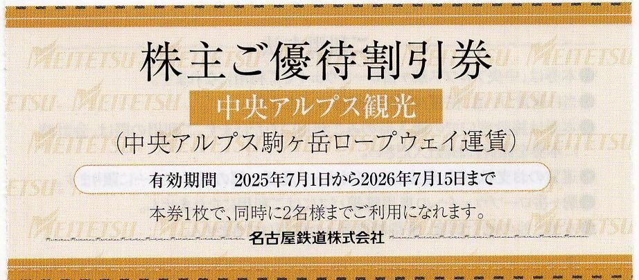 ・名古屋鉄道の株主優待割引券です。中央アルプス観光、 中央アルプス駒ケ岳ロープウェイでご利用になれます。