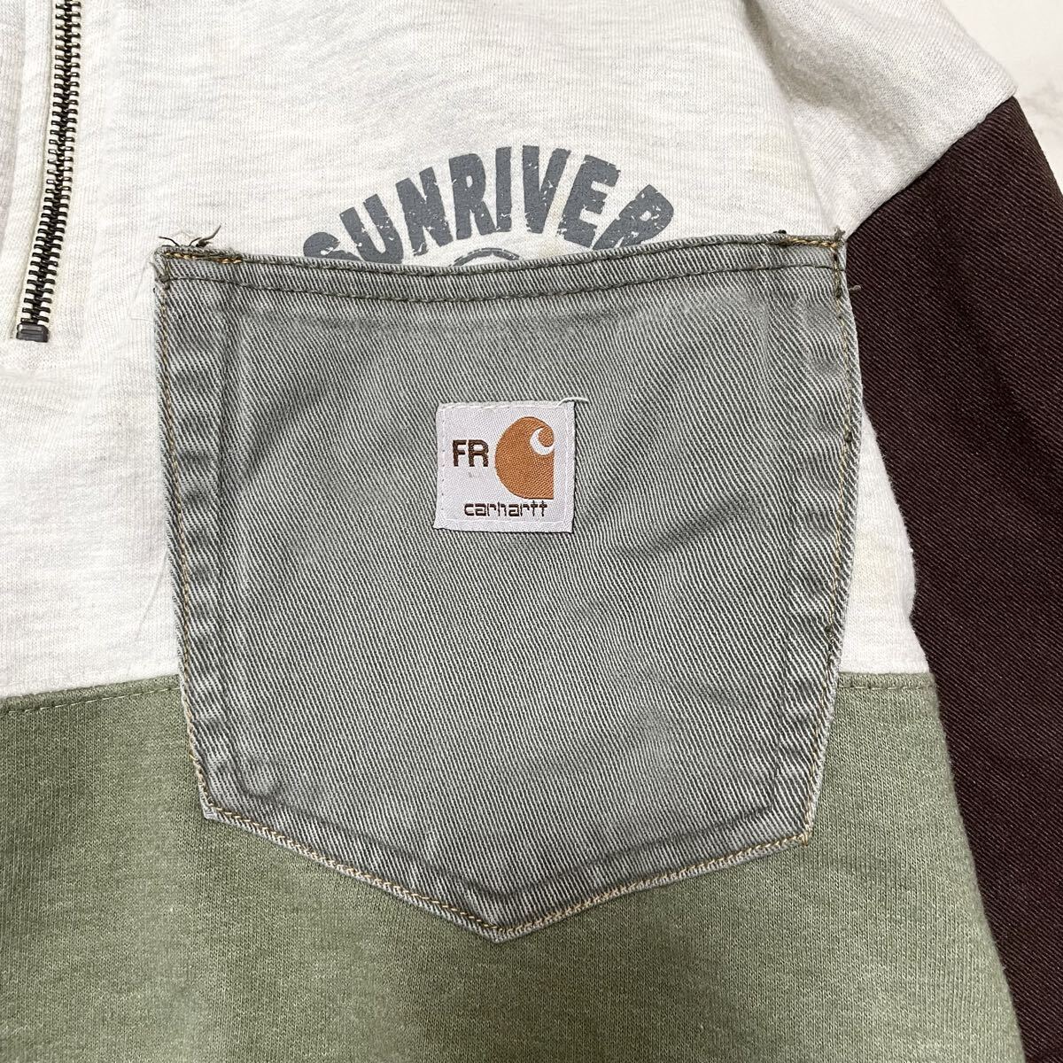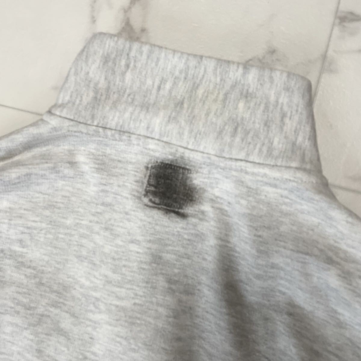 ポケットの裏側のロゴ部分、裾、後ろ身頃の首元に汚れがありますが、気にならない方にはお得な価格です。