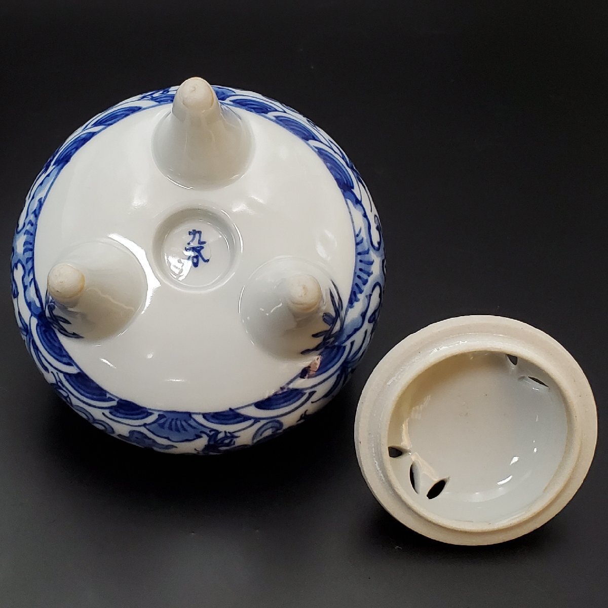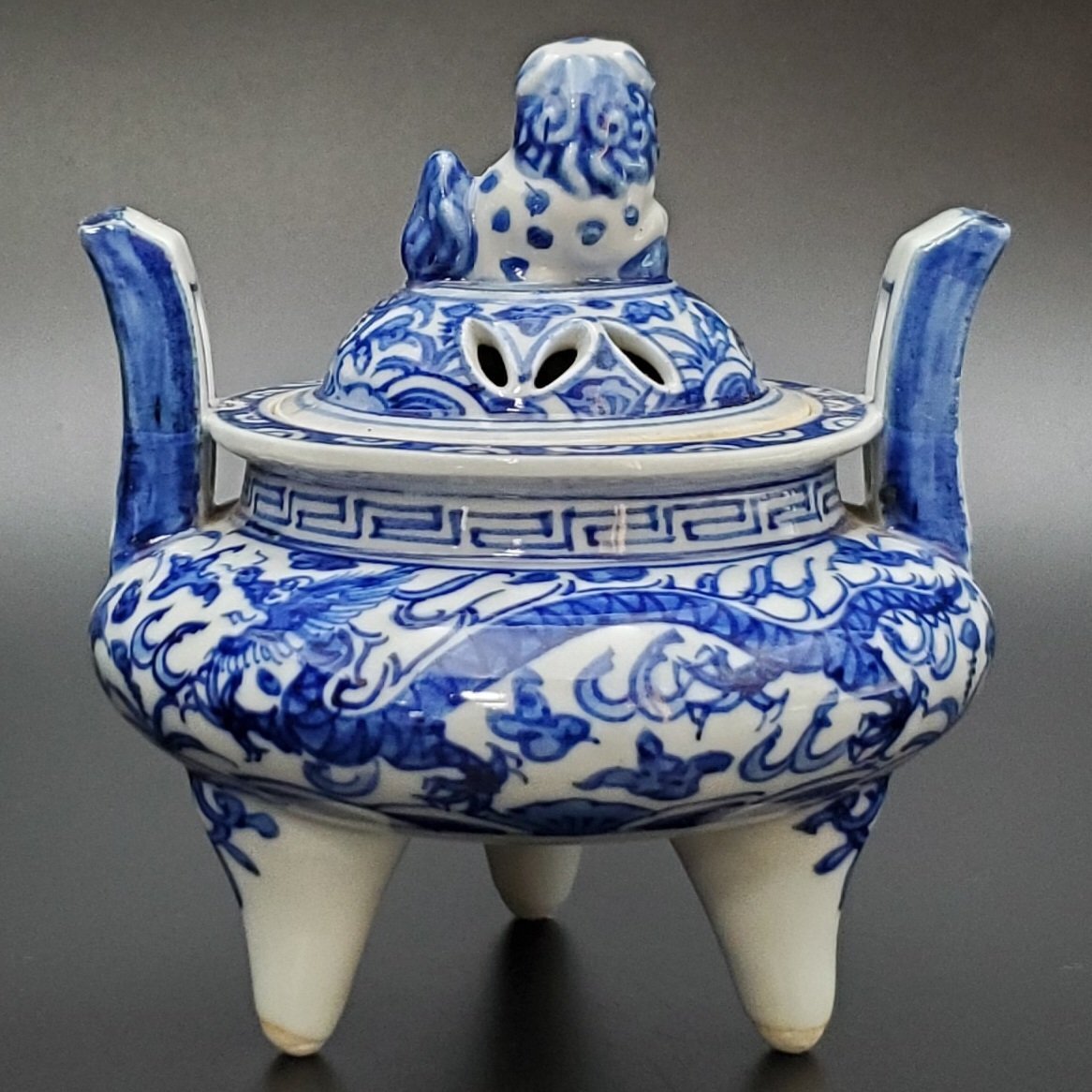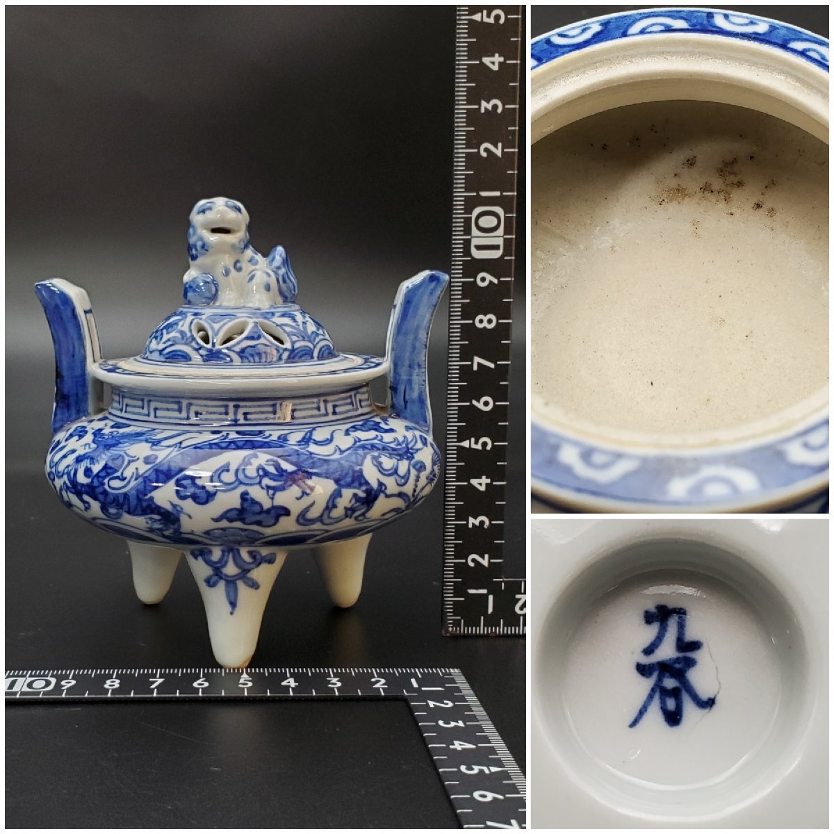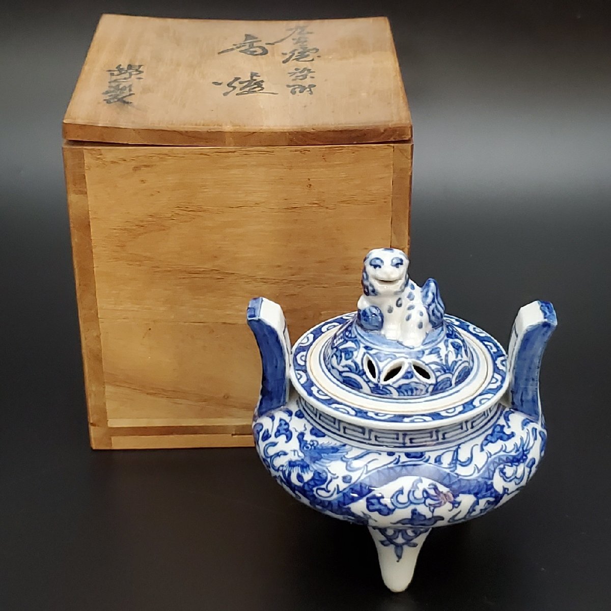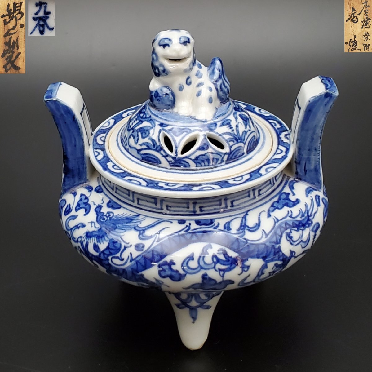 【宝蔵】九谷焼 錦山製 染付龍文獅子摘み香炉 高さ約11cm 共箱