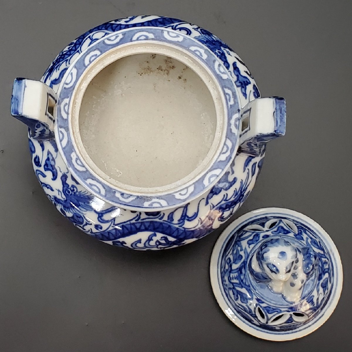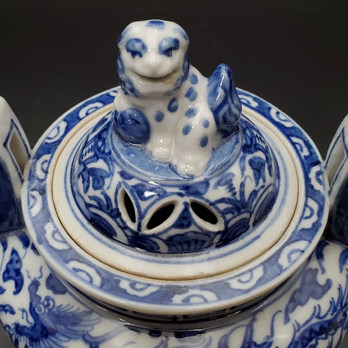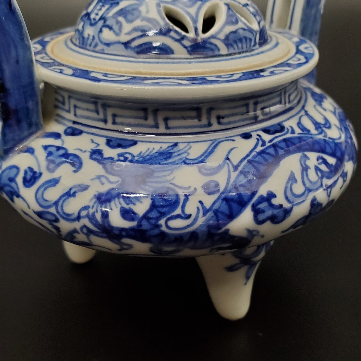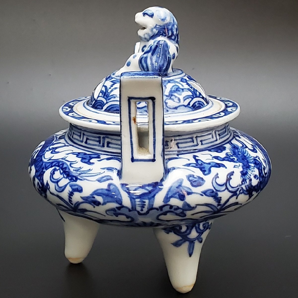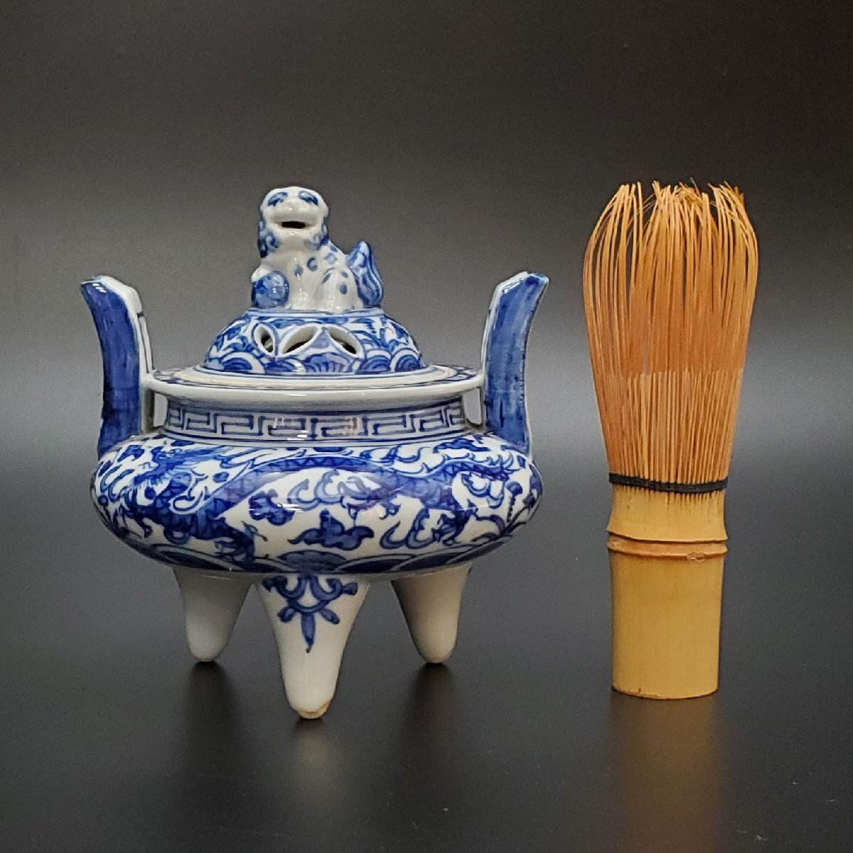 【宝蔵】九谷焼 錦山製 染付龍文獅子摘み香炉 高さ約11cm 共箱