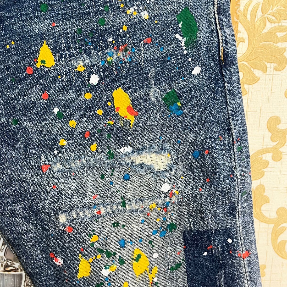 大胆なスプラッシュペイントが個性を引き立て、ストリート系コーデの主役に。膝周り部分に施したダメージ加工が、ヴィンテージ風の味わいを演出。前後にポケットを配置し、スマホや財布などの小物収納に便利なだけでなく、スタイリッシュなシルエットを保つ工夫が施されています。