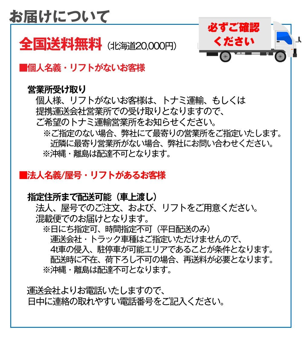 全国送料無料(北海道20,000円) ■個人名義、リフトがないお客様 営業所受け取り 個人様、リフトがないお客様は、トナミ運輸もしくは提携運送会社営業所での受け取りとなりますので、ご希望のトナミ運輸営業所をお知らせください。 ※ご指定のない場合、弊社にて最寄りの営業所をご指定いたします。 近隣に最寄り営業所がない場合、弊社にお問い合わせください。 ※沖縄・離島は配達不可となります。 運送会社よりお電話する場合がございますので日中に連絡の取れやすい電話番号をご記入ください。 ■法人名義・屋号、リフトがあるお客様 指定住所まで配送可能(車上渡し) 法人、屋号でのご注文、および、リフトをご用意ください。 混載便でのお届けとなります。 ※日にち指定可、時間指定不可(平日配送のみ) 運送会社・トラック車種はご指定いただけませんので、4t車の侵入、駐停車が可能エリアであることが条件となります。 配送時に不在、荷下ろし不可の場合、再送料が必要となります。 ※沖縄・離島は配達不可となります。 運送会社よりお電話する場合がございますので日中に連絡の取れやすい電話番号をご記入ください。 |