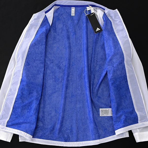 アディダスジャパン正規品 定価17,600円 新品 未使用 紙タグあり JAPAN:XLサイズ(画像は別サイズで撮影) チェスト97~100 ※商品に記載されたサイズ・寸法です※ ラグランのため肩幅計測不能 ゆき丈87cm(首裏~袖先) 身幅59cm 袖下丈52.5cm(脇下~袖先) 着丈72cm 本体:ナイロン87% ポリウレタン13% 身頃裏生地:ポリエステル100% ホワイト×ブルー |